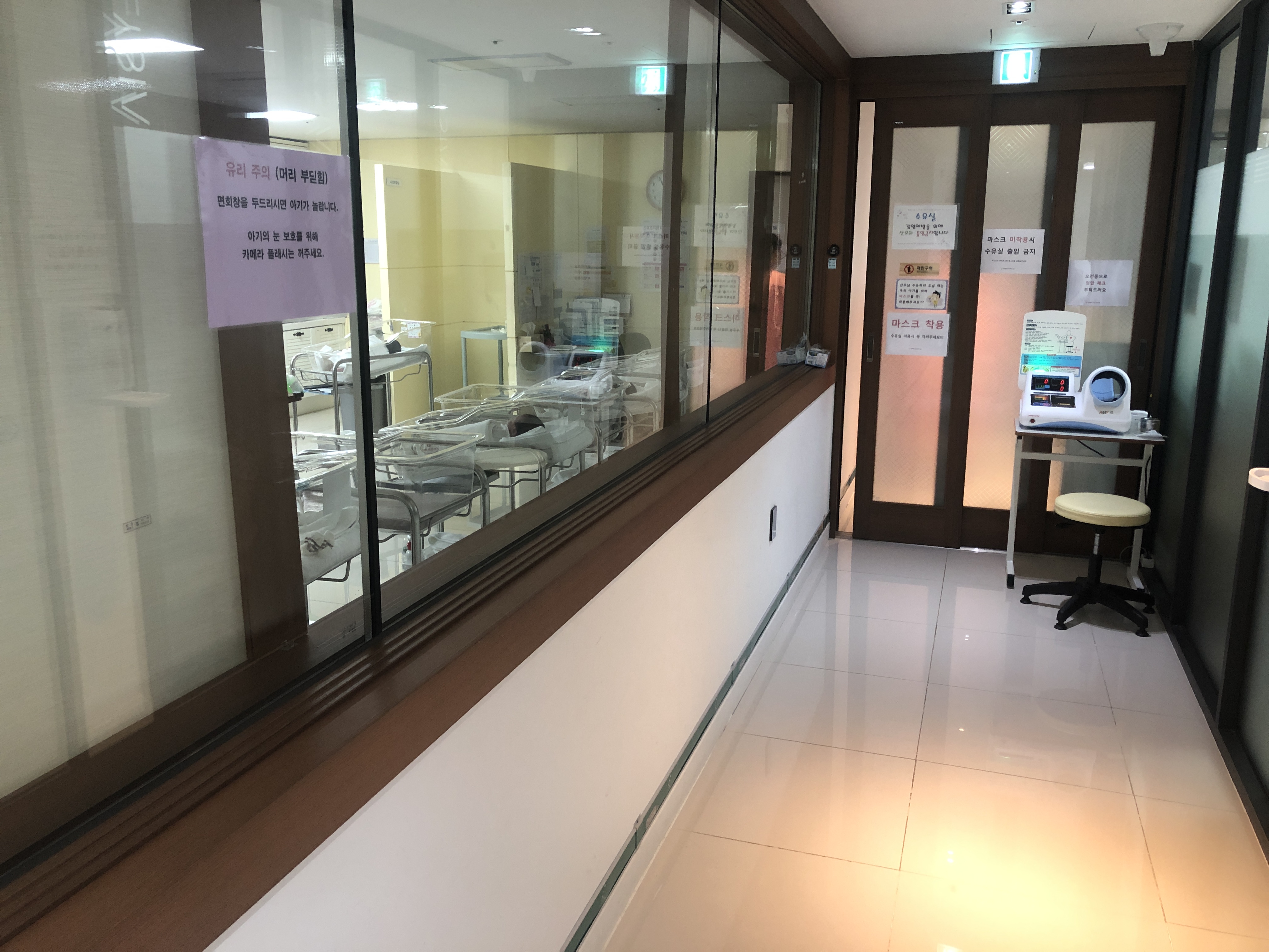 요렇게 신생아 케어실인데요~! 조리원에 손소독기가 있는데 들어가시기전 소독하시고~ 마스크 끼시고~! 그렇게 들어가시면 됩니다. 아마 오른쪽이 수유실일꺼에요~! 참 수유는 어떤 시스템으로 돌아가냐면 수유하고 싶으시면 아기가 깨서 밥을 찾으면 콜을 달라고 하시면 됩니다. 그러면 객실로 연락이 와요~! 정 힘드시면 그냥 분유 먹이라고 하시면 되구요~! 또 방에 유축기가 다 있어서 유축하셔서 가져다 주셔도 됩니다.