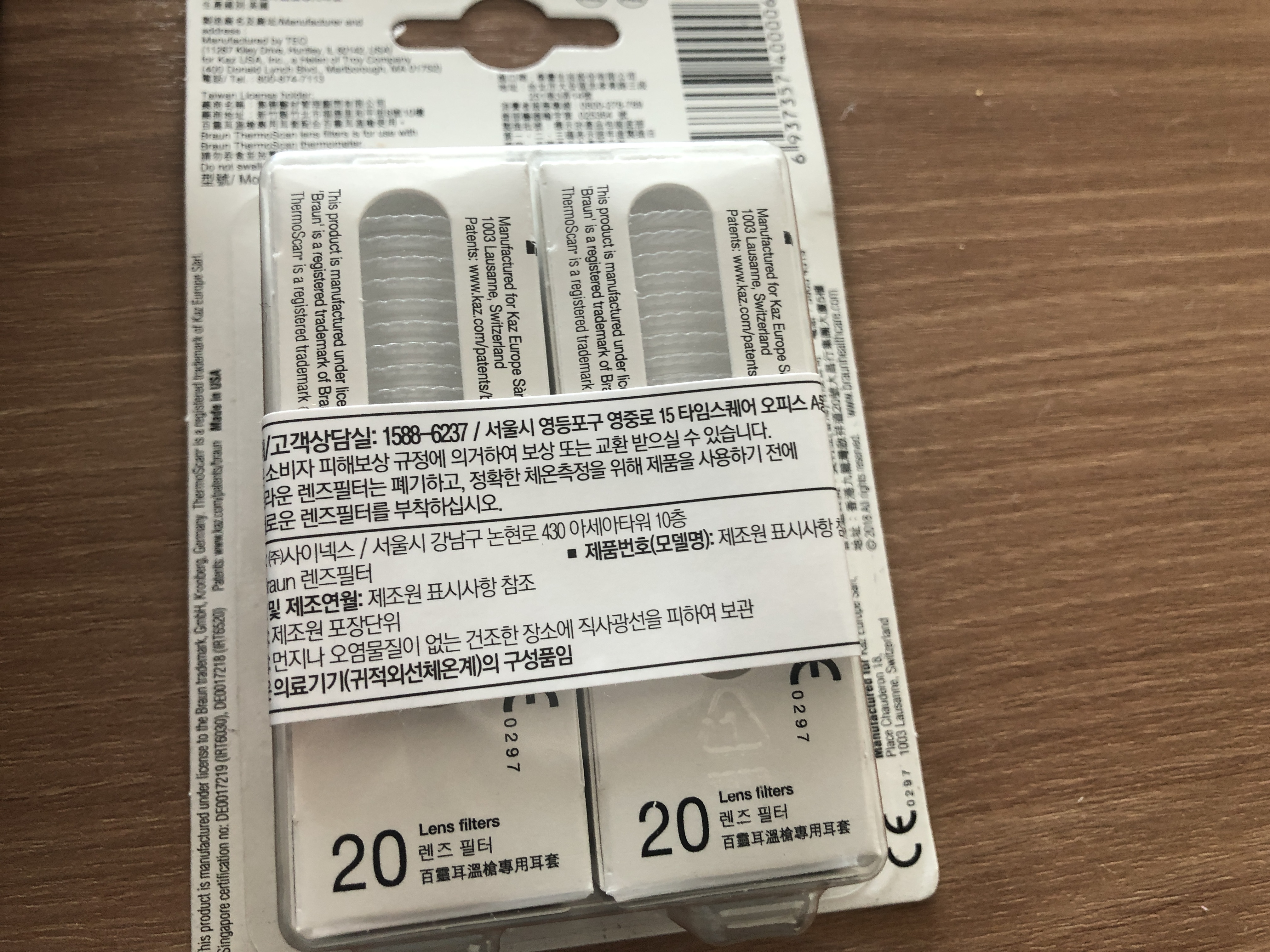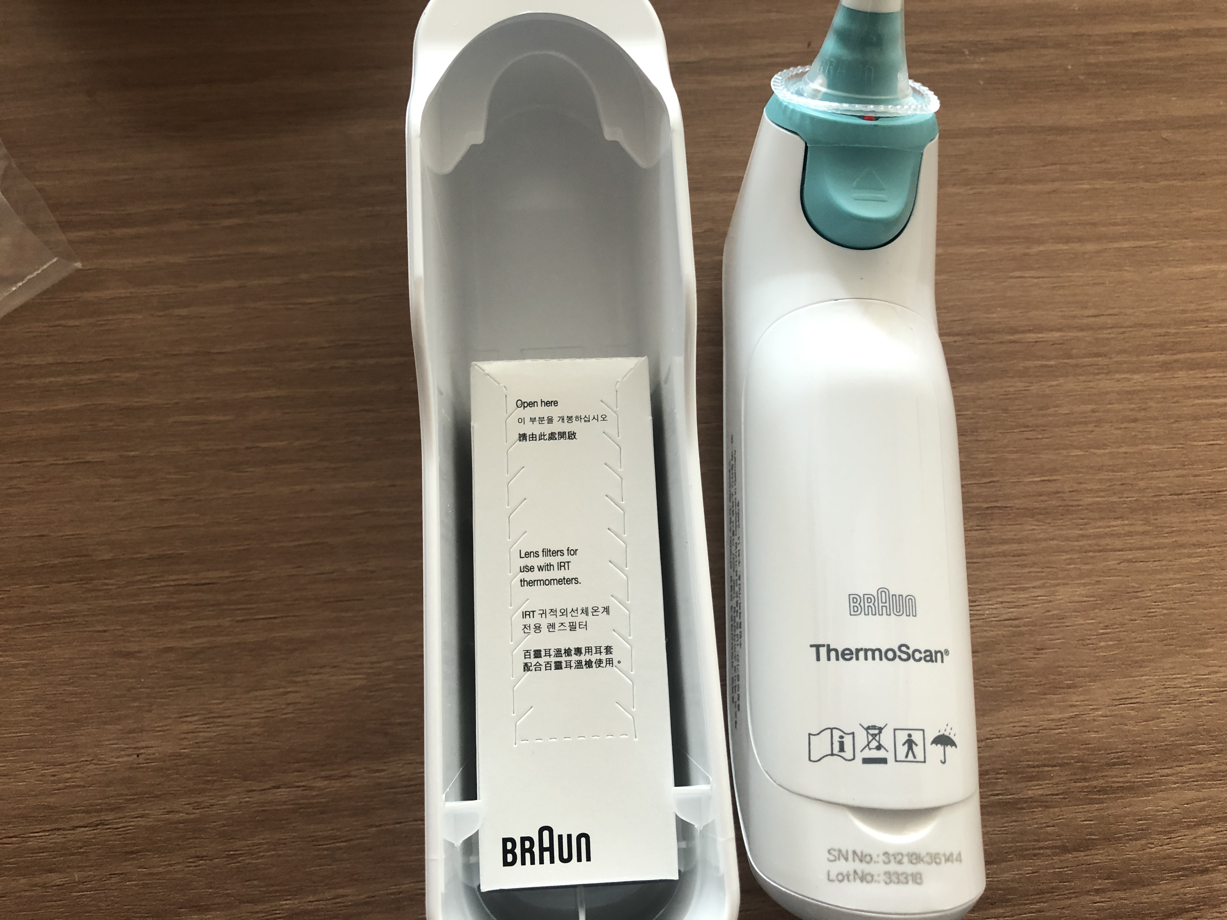 기본적으로 필터 한통과 건전기가 꼽혀져 있네요..! 건전지는 AA건전지 2개가 들어가 있구요~! 필터도 저 통안에 넣어 놓으면 잊어먹지 않고 매일 사용할때 마다 교체를 할 수 있겠네요..! 필터 바꾸는건 나름 룰을 정해서 하시면 될 것 같아요. 저희는 사용하고 그냥 넣어뒀다가 다시 사용할때 바꾸기고 했어요~! 사용하고 바꿔놓고 다음엔 그냥 측정하셔도 되구요~! 필터 빼는방법은 저기 누름 버튼이 있는데 누르면 똑~하면서 튀어 나와요. 그러고 버리고 새 것을 끼우시면 될 것같습니다. 사용방법은 그냥 보셔도 다 아실거에요. 전원버튼 눌러서 키고 귀에 가져간뒤 측정버튼을 누르시면 됩니다. 너무 늦게 산거 같긴하지만.. 여러가지 다 찾아보면서 구입한 브라운 체온계입니다~!