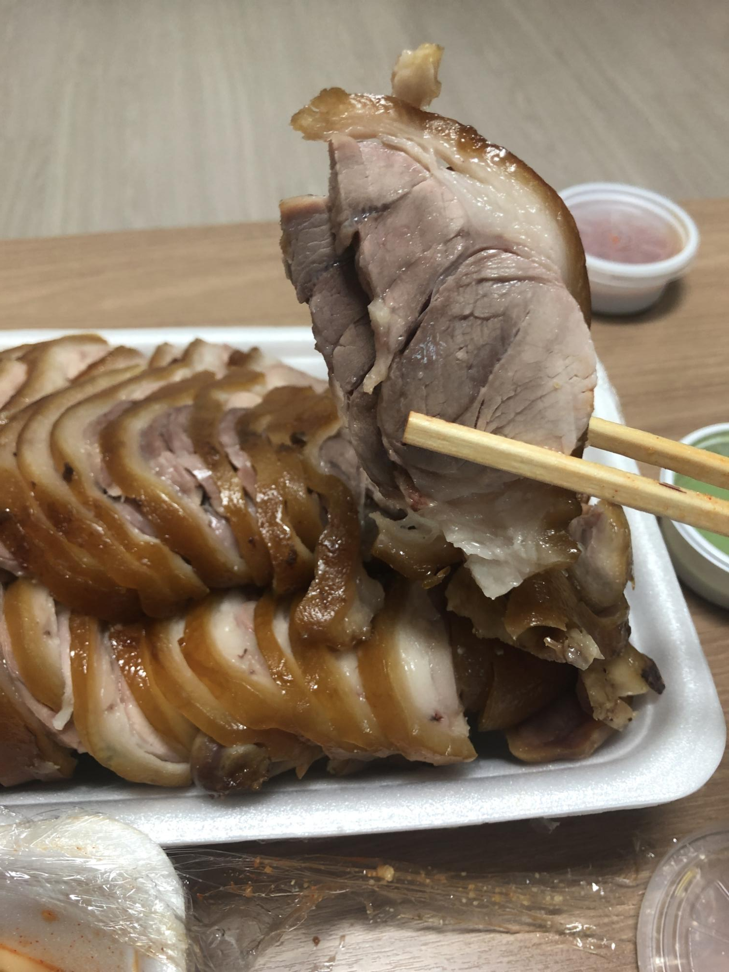 막국수도 맛있게 보이고.. 족발이 엄청 촉촉하죠?? 사진으로도 느껴지는 촉촉함 이네요~! 역시 그때 그맛이 그대로 나는 포항 한양족발 입니다. 양도 적은편은 아니었어요. 와이프와 다 먹고 좀 남겼으니~! 밑에는 큰 뼈가 몇개 들어있네요. 뼈에 붙어있는 살을 먹는 것도 참 맛있죠~! 이렇게 족발 대를 둘이서~! 글을 쓰다보니 또 먹고 싶어집니다..ㅎㅎ 이것으로 포항 족발 맛집 오거리 한양족발 후기를 마치겠습니다..!