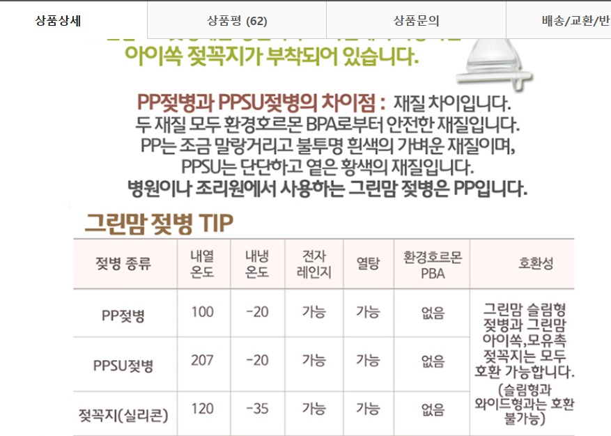 pp젖병과 ppsu 젖병의 차이점이 설명되어 있는데요~! 재질 차이라고 합니다. 두 재질 모두 환경호르몬 bpa로부터 안전한 재질이라고 합니다. pp는 조금 말랑거리고 불투명 흰색의 가벼운 재질이고 ppsu는 단단하고 옅은 황색의 재질이라고 합니다. 병원이나 조리원에서 사용하는 젖병은 pp재질이라고 하는데 내열온도 내냉온도 등등 온도표가 있으니 참고하시길 바래요~! 열탕과 전자렌지 둘다 가능하다고 합니다.