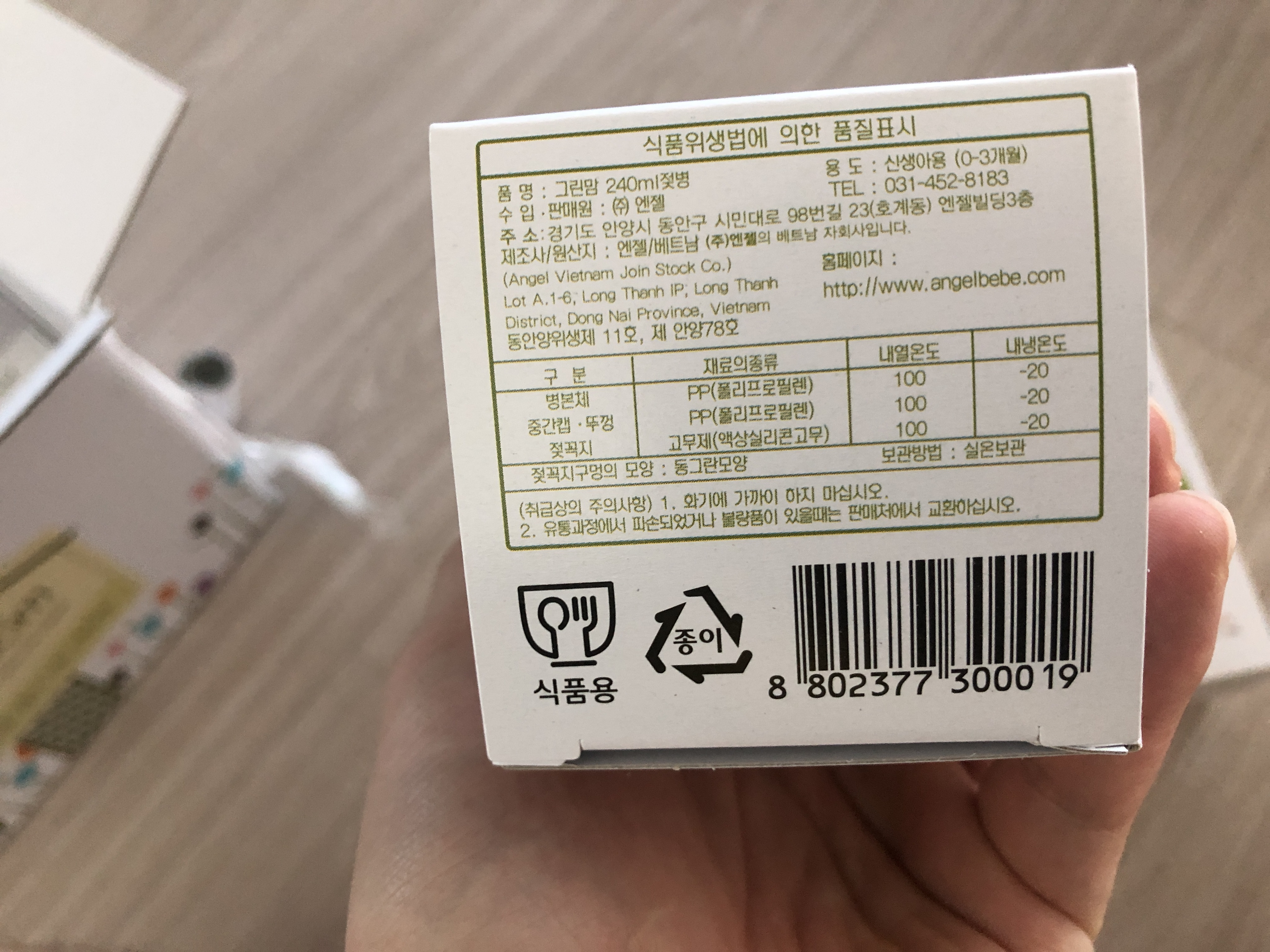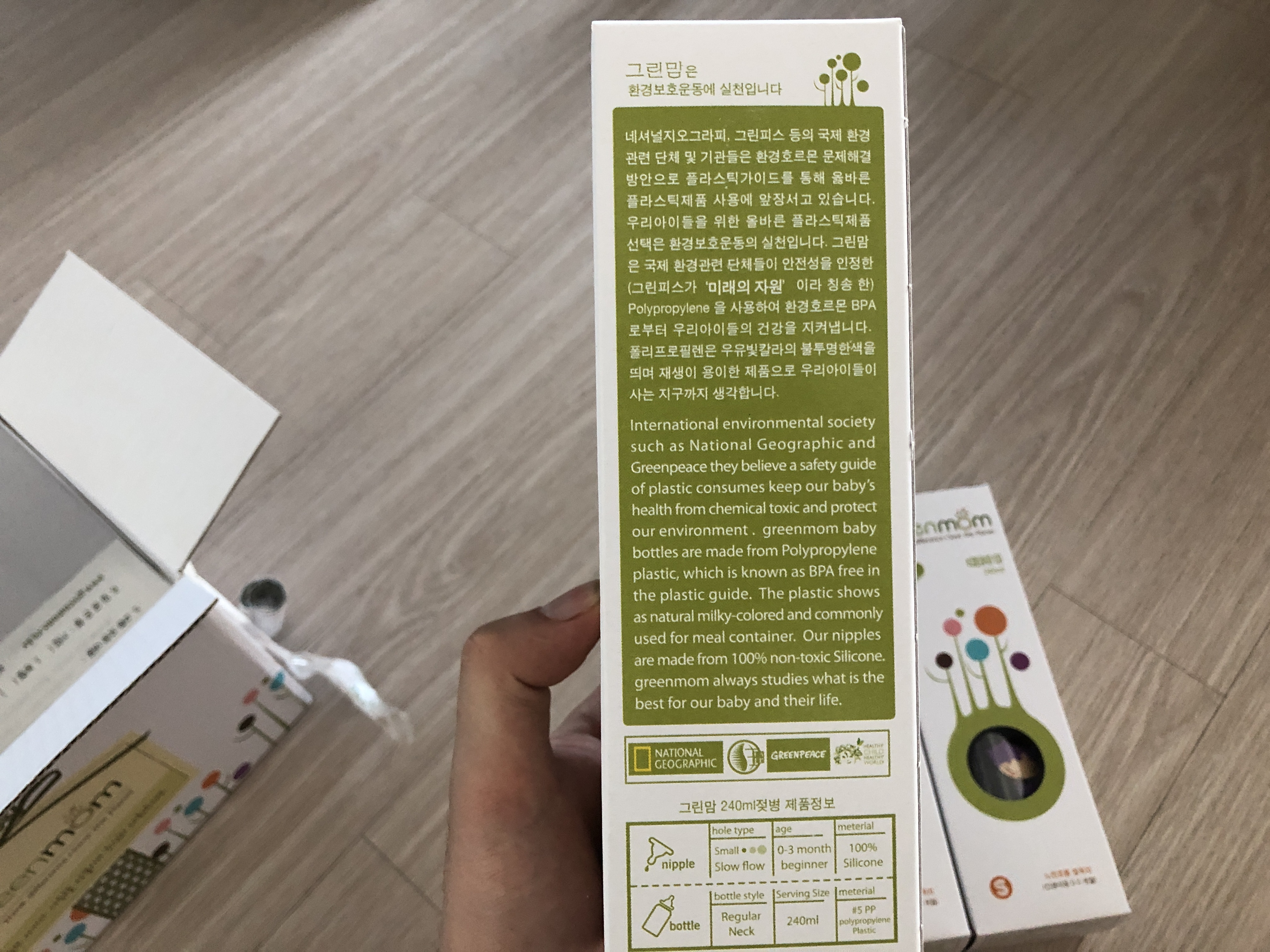 그린맘 젖병의 상자의 모습입니다..! 그린맘 젖병은 플라스틱가이드를 통해 올바른 플라스틱 제품을 만드는데 앞장서고 있다고 합니다. 그린피스가 미래의 자원이라고 칭송한 polypropylene을 사용하여 환경호르몬 BPA로 부터 우리 아이들의 건강을 지켜내자 라고 적혀있네요~! 환경호르몬이 안나온다니 참 다행이네요 ㅠ 요즘 국제적으로 플라스틱에 대한 문제가 커지고 있는데 잘 지켜주셨으면 합니다..! 제조사는 엔젤이고 원산지는 베트남 입니다~!