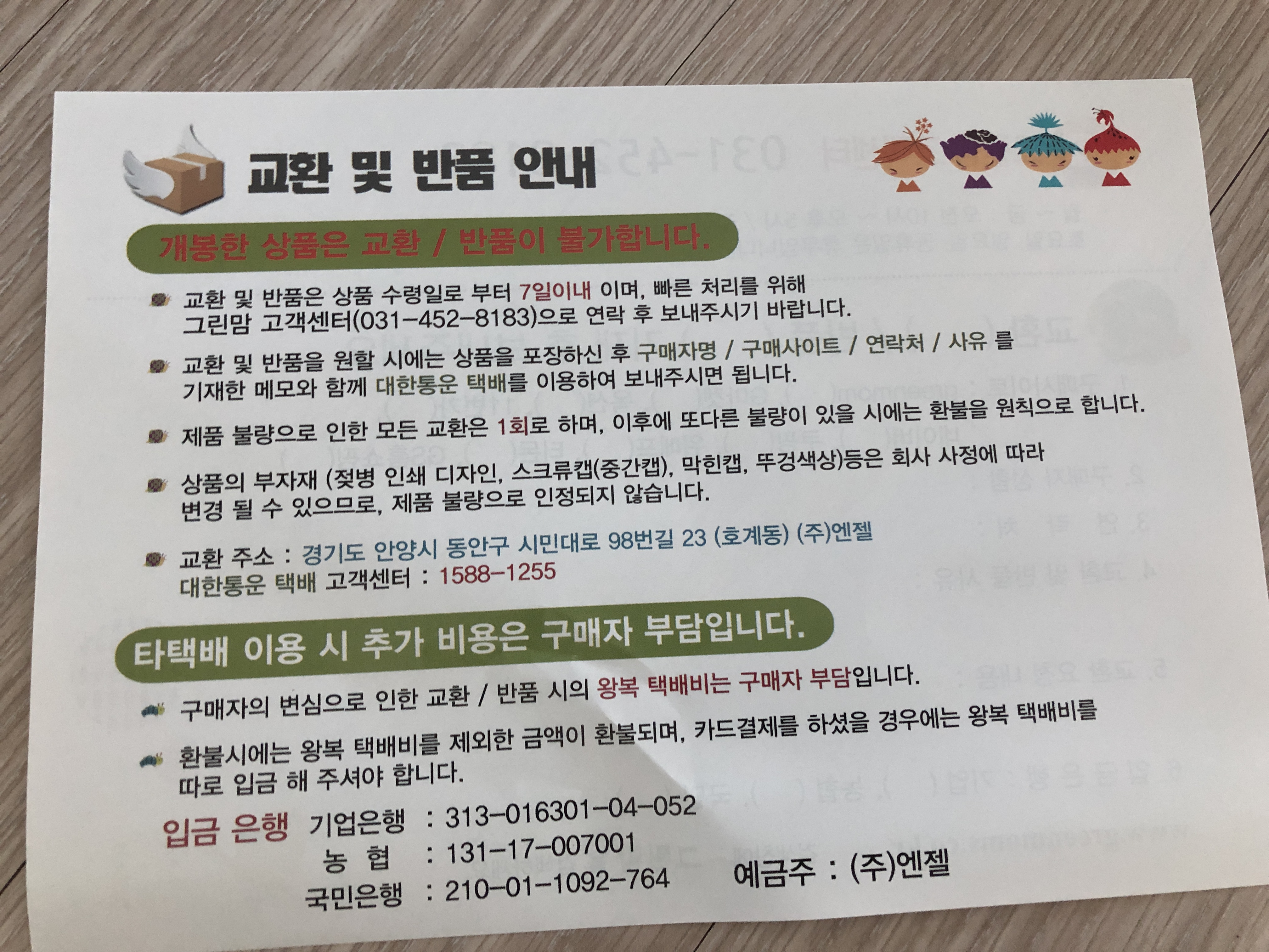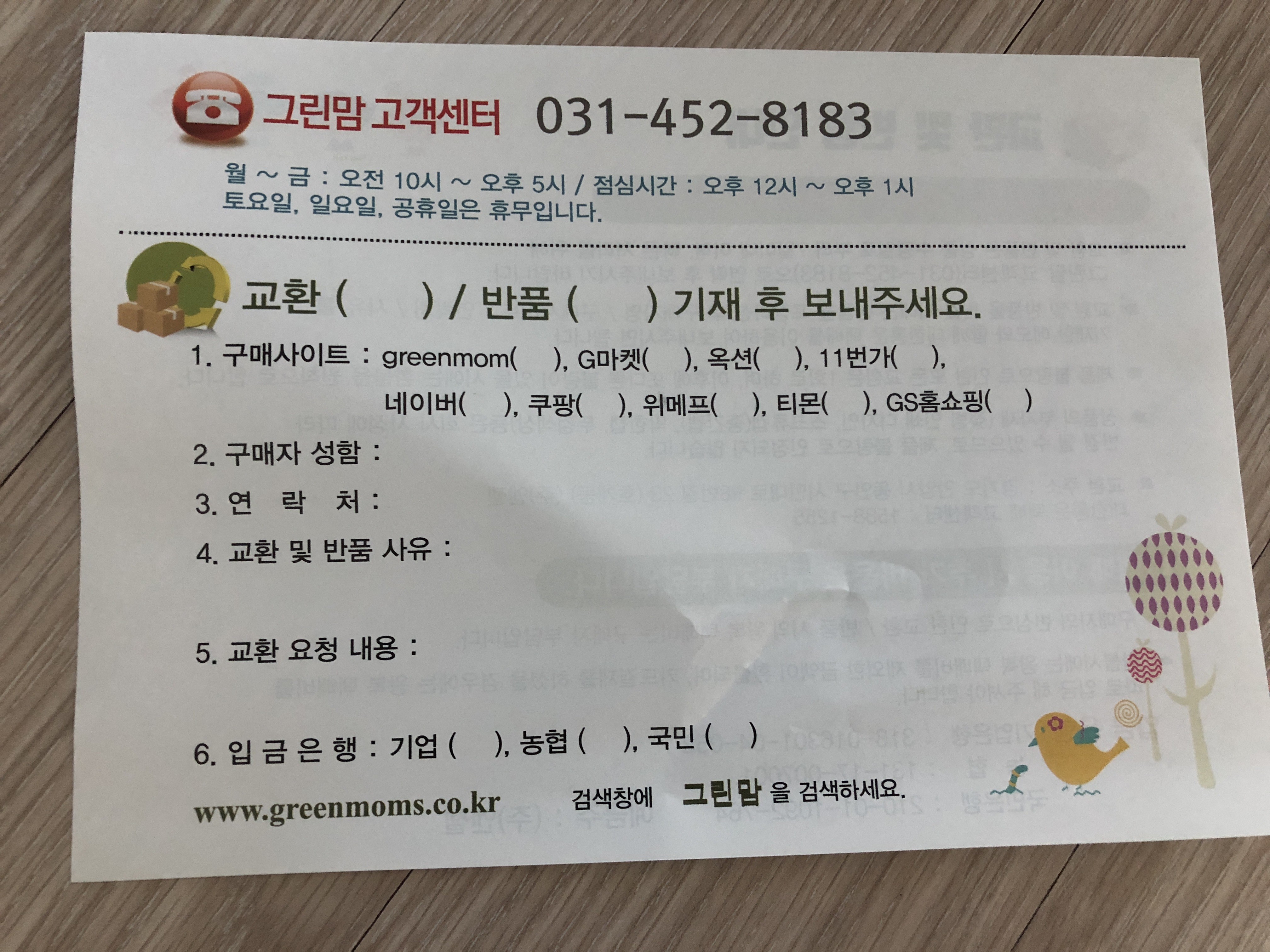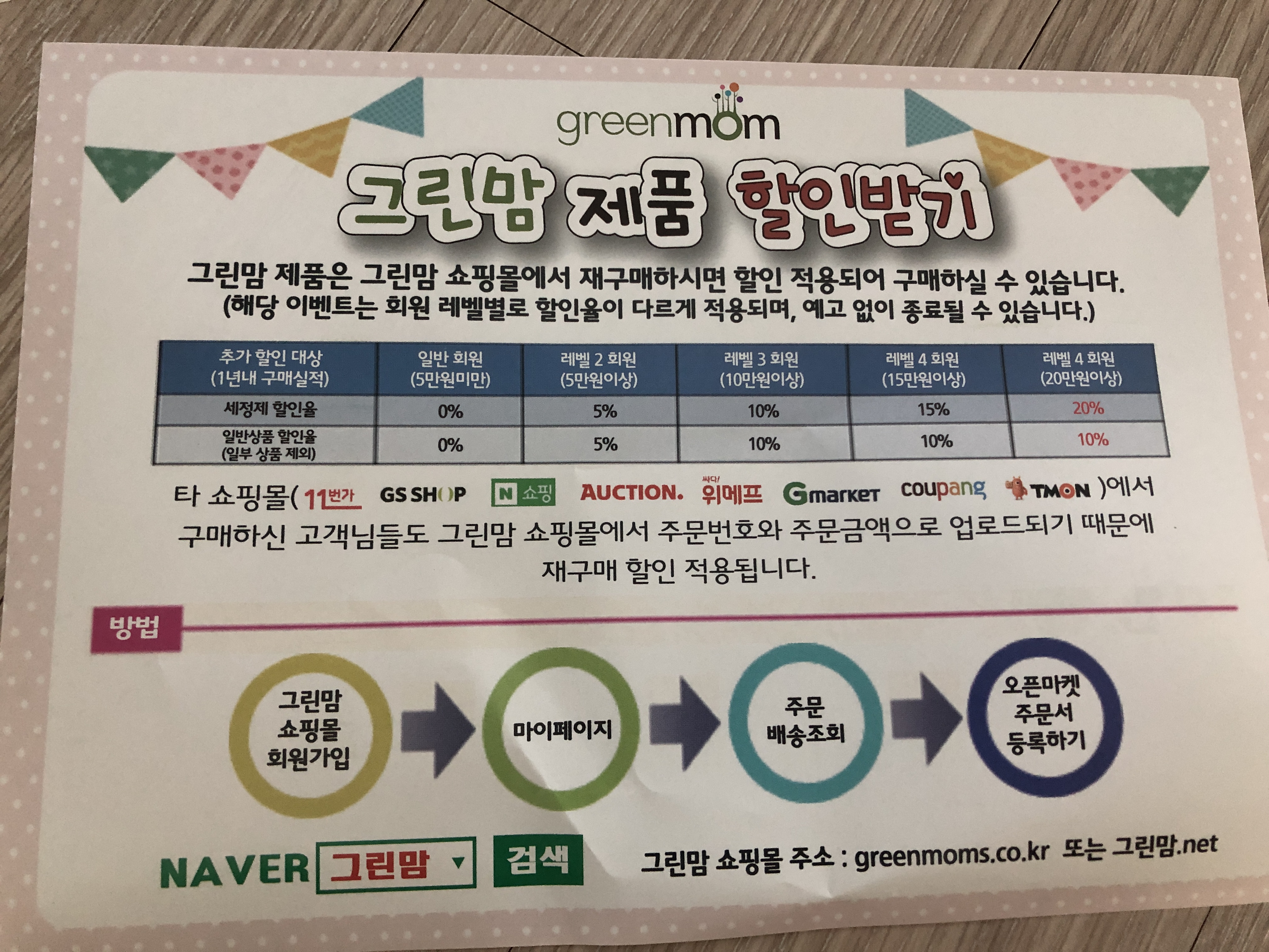 반품하는 방법과 제품 할인을 받는 방법이 적힌 쪽지가 요렇게 양면으로 되어 있습니다. 그린맘 홈페이지에서 따로 구입이 가능하네요..! 그리고 타 쇼핑몰에서 구매하신 고객도 그린맘 쇼핑몰에서 주문번호와 주문금액으로 업로드되기 떄문에 재구매 할인 적용이 된다고 합니다~! 해당 이벤트는 회원 레벨별로 할인율이 다르게 적용되며 예고 없이 종료될 수 있다고 합니다..!