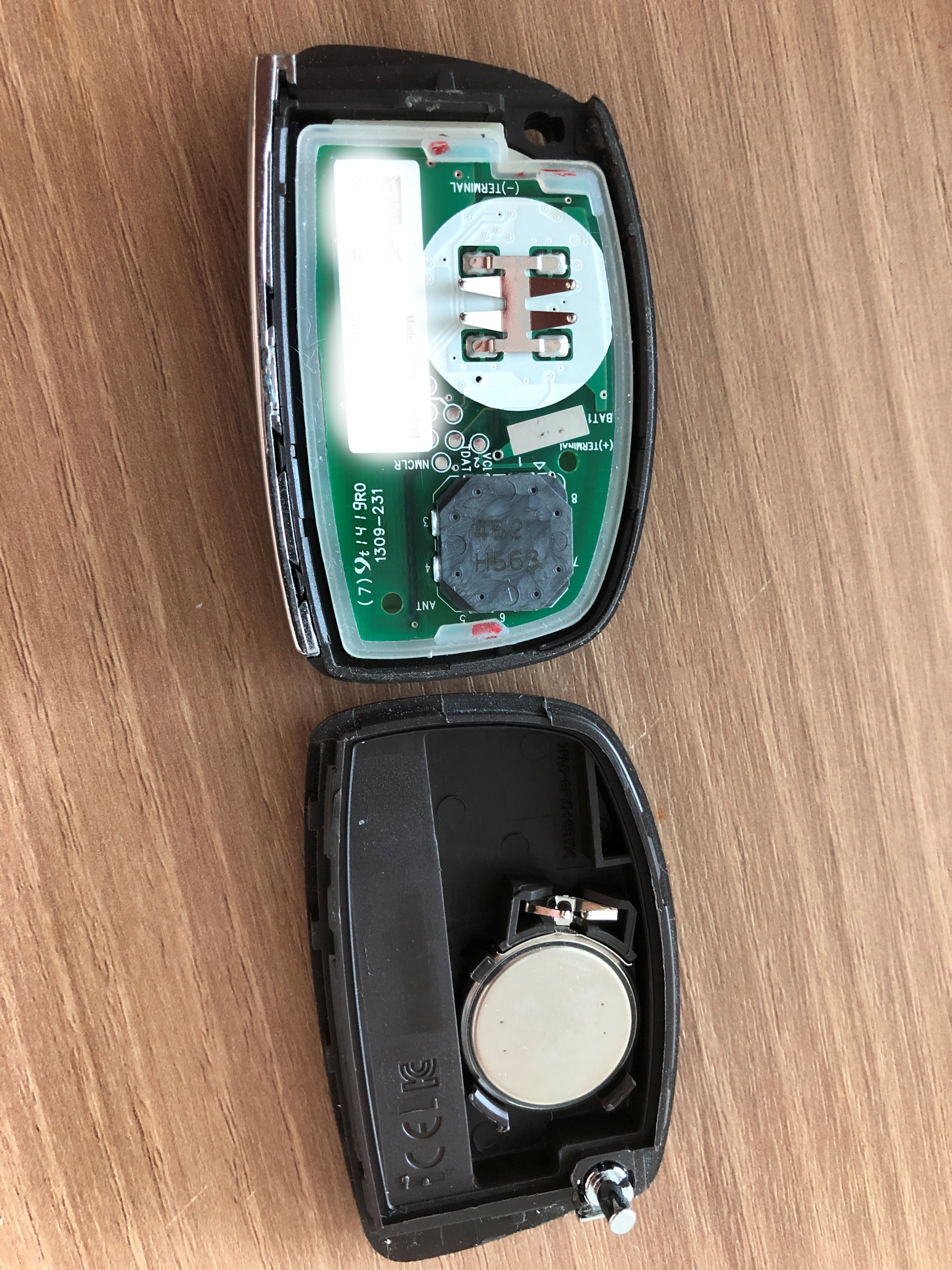 짜잔~~! 열면 이런 모습이 나옵니다. 위에 기판이 있는건 따로 건드릴 필요가 없습니다. 밑에 배터리만 빼고 그냥 바꿔주시면되요~! 현대 자동차의 i40의 배터리는 CR2032...! 마트에서 따로 구입을 해서 그냥 배터리만 바꿔 끼우시면됩니다. 간단하죠??