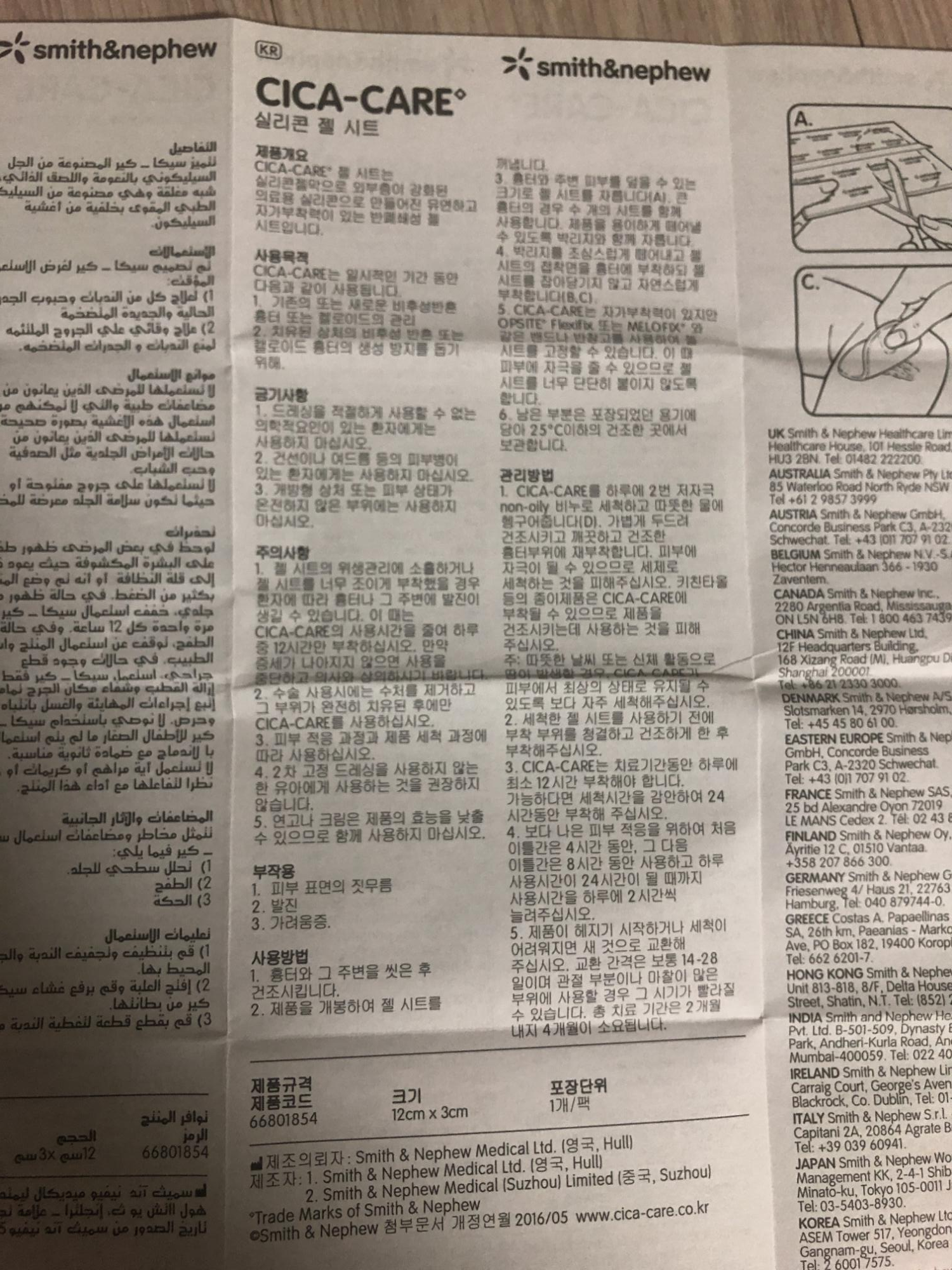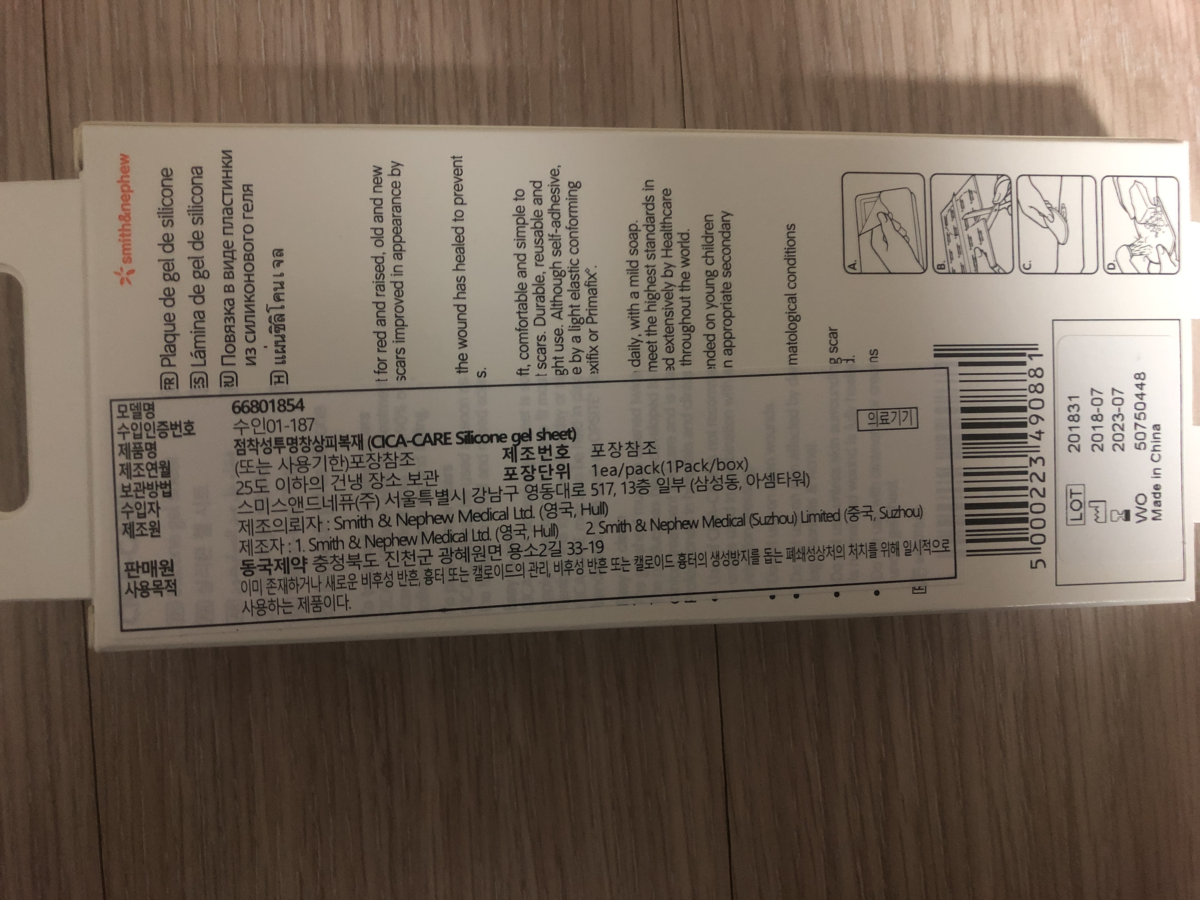 사용방법은 흉터와 그 주변을 씻은 후 건조시키고 제품을 개봉하여 젤 시트를 꺼내서 바르시면 됩니다. 물론 상처가 작으면 자르셔서 사용하셔도 됩니다~! 중요한 부분..! 시카케어 젤 시트가 말랑 말랑 하기 때문에 늘어나는데 늘려서 붙이면 안된다고 해요~~!! 늘려서 붙이지 마시고! 딱 맞게 붙이시고.. 만약 잘라서 사용하셨는데 남은게 있다면 포장되어 있는 용기에 담아 25도 이하의 건조한 곳에서 보관하시면 된다고 합니다..!!