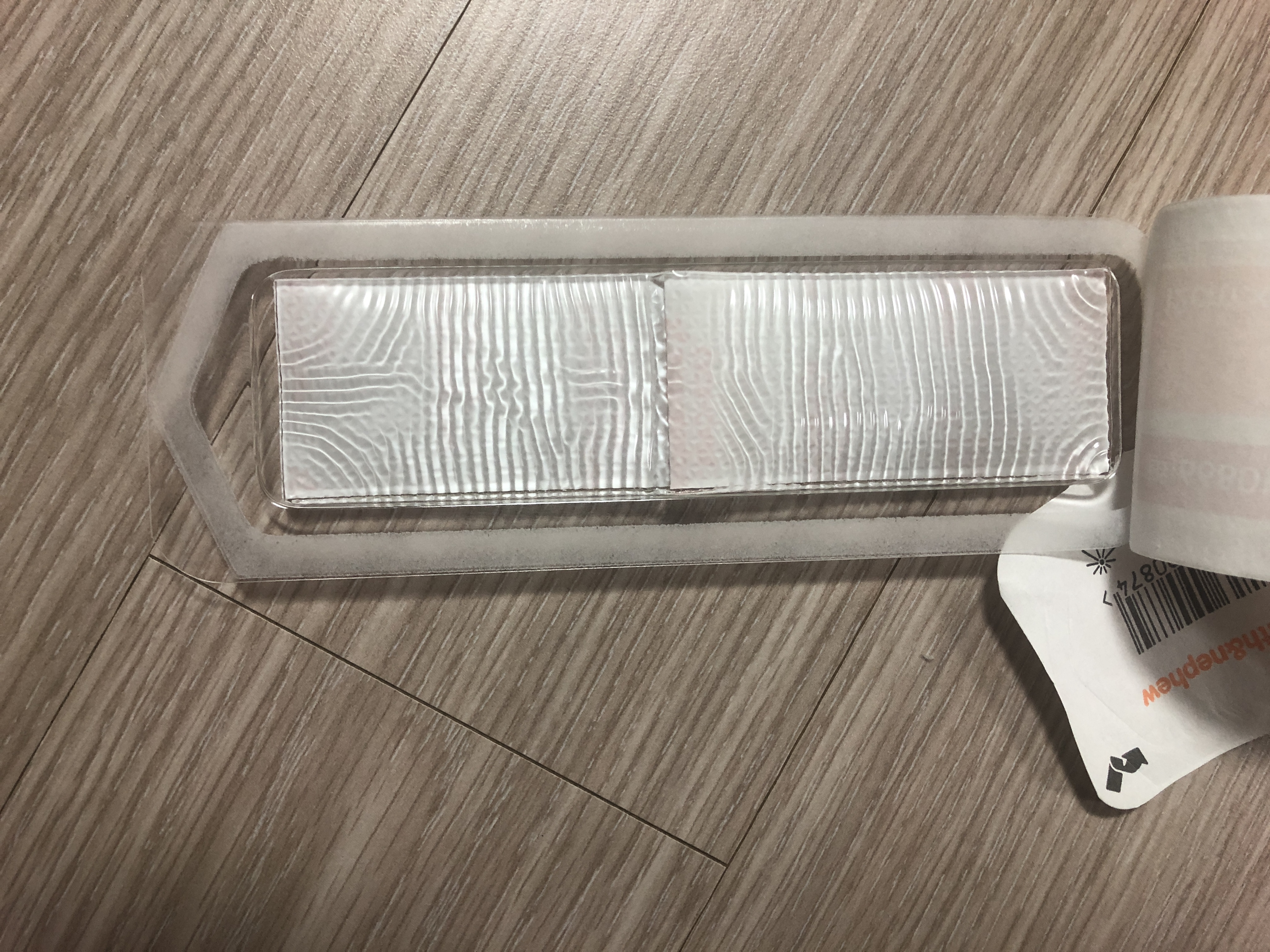 요렇게 일반 밴드처럼 생겼구요~! 뒤에 있는걸 뜯어서 그냥 붙이시면 됩니다. 와이프의 상처가 10cm정도 되니까 하나 붙이니 딱 맞더라구요~! 이걸로 흉터가 많이 좋아져야 될텐데... 여러 후기를 보니 오랜기간 사용하니 표시가 난다고 하시더라구요..! 그리고 많은 분들이 추천도 하시고..! 꼭 이걸로 흉터가 사라지지는 못해도.. 연해지기를 기대합니다 ㅎㅎ
