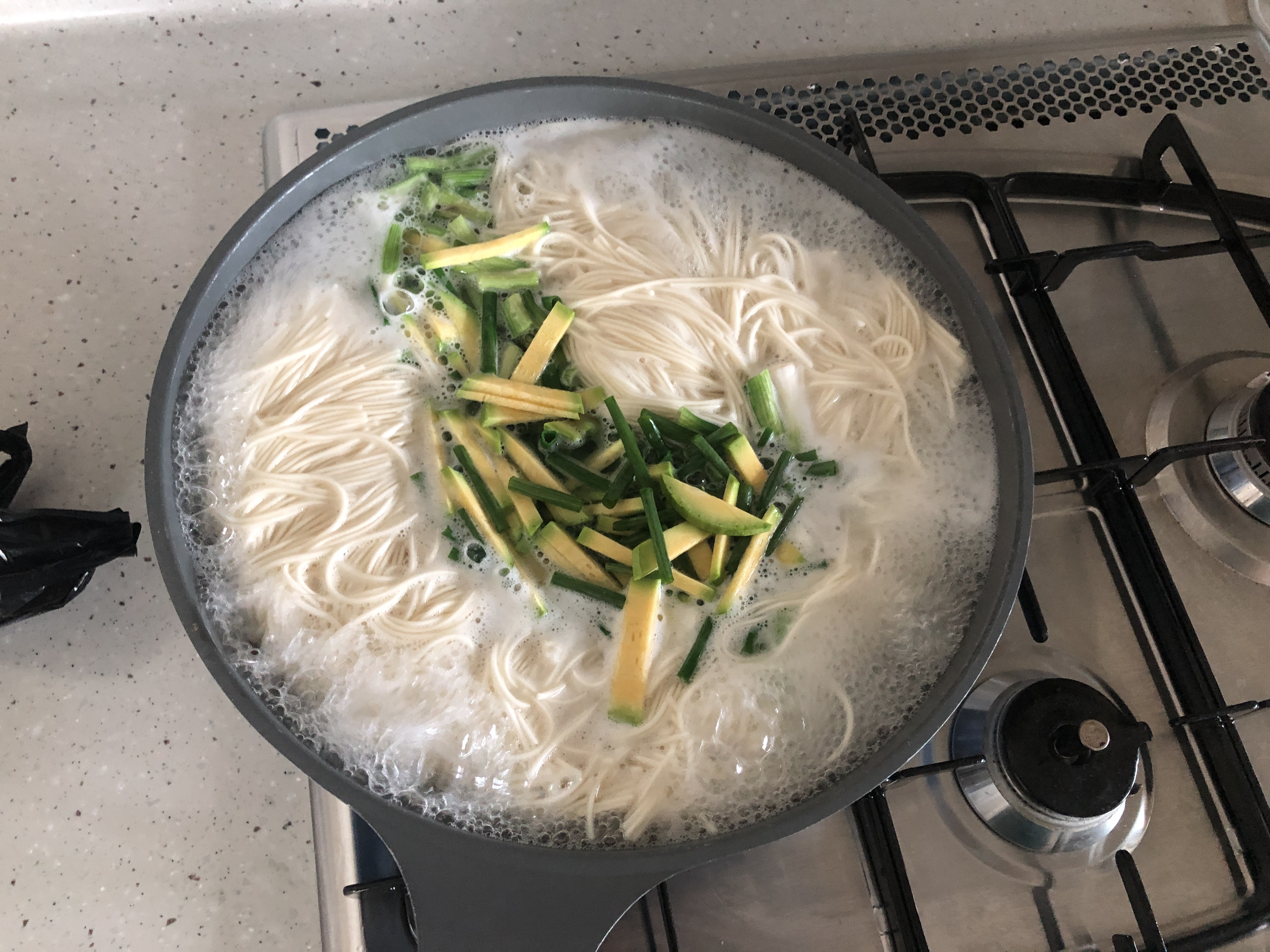 이렇게 면이 완전히 다 익기전에 아까 썰어놓았던 쪽파와 호박을 넣습니다..! 이렇게 보니 참.. 굵게 썰었네요..ㅎㅎ 제가 아직 스킬이 많이 부족한가 봅니다..! 이렇게 퍼지기전에 언능..! 넣어서 익혀요..!!