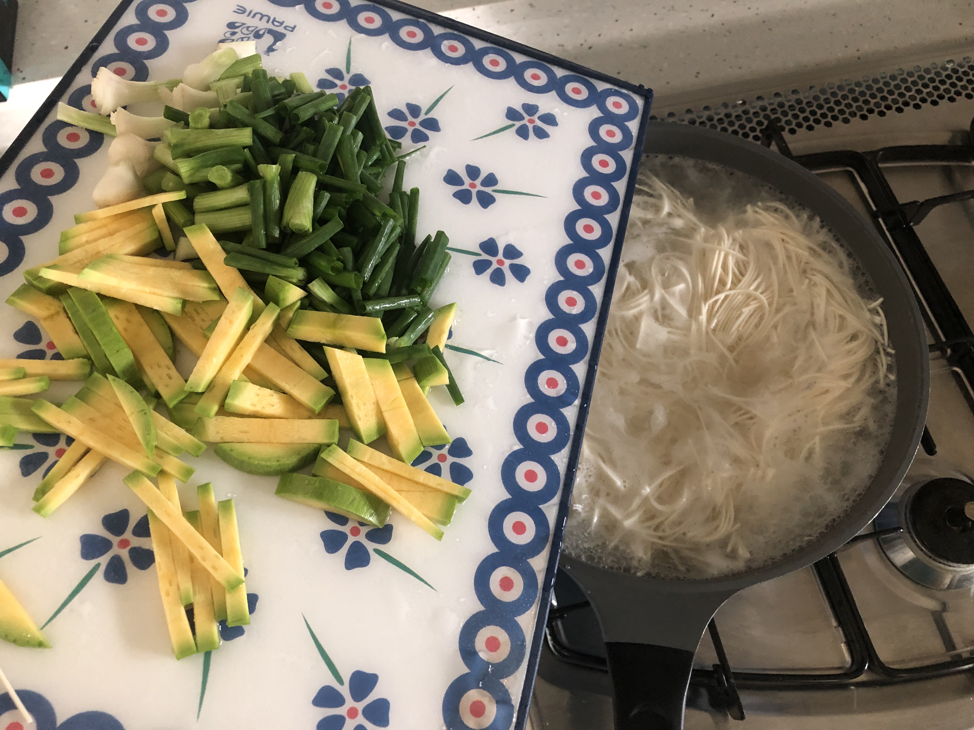 일단..! 말씀을 드리자면 저는 요리에 요자도 모르는.. 국수에 국자도 모르는 사람입니다.. 음식을 와이프가 다 해주지.. 제가 할줄아는건 없어요.. 요즘 와이프가 육아에 힘들어 제가 .. 이것저것 해줄려고 인터넷 찾아보고 따라하고 있습니다.. 쪽파랑 애호박을 사서 썰었는데 솔직히 안예쁘고 그래요 ㅎㅎ 이해좀 해주세요~! 일단 애호박과 쪽파를 썰었습니다..!할머니께서 말씀하시길 이런건 국수 면을 삶을때 마지막에 넣어서 익혀도 된다고 하셨어요..! 당근은 제가 안넣었어요..ㅎㅎ