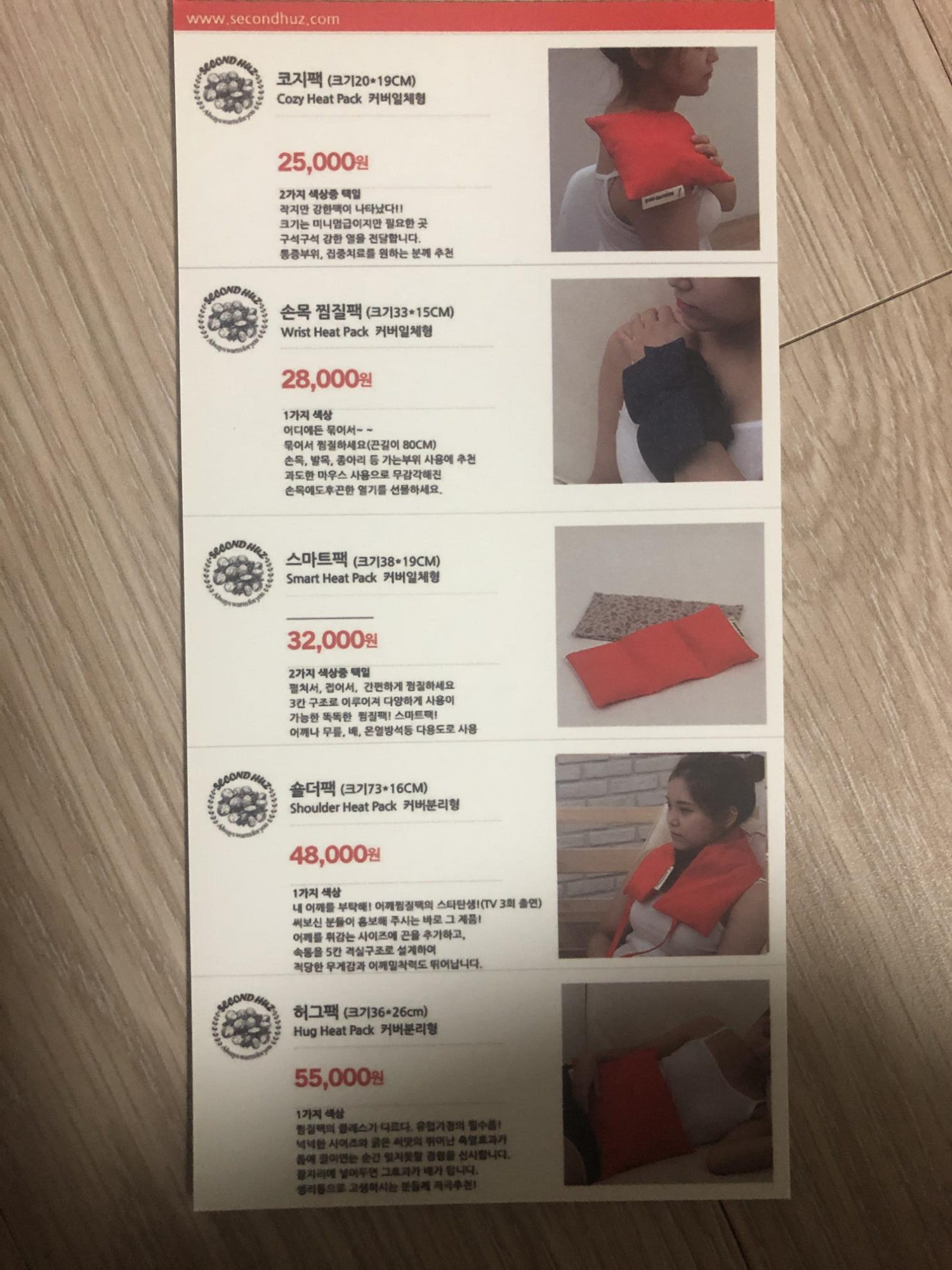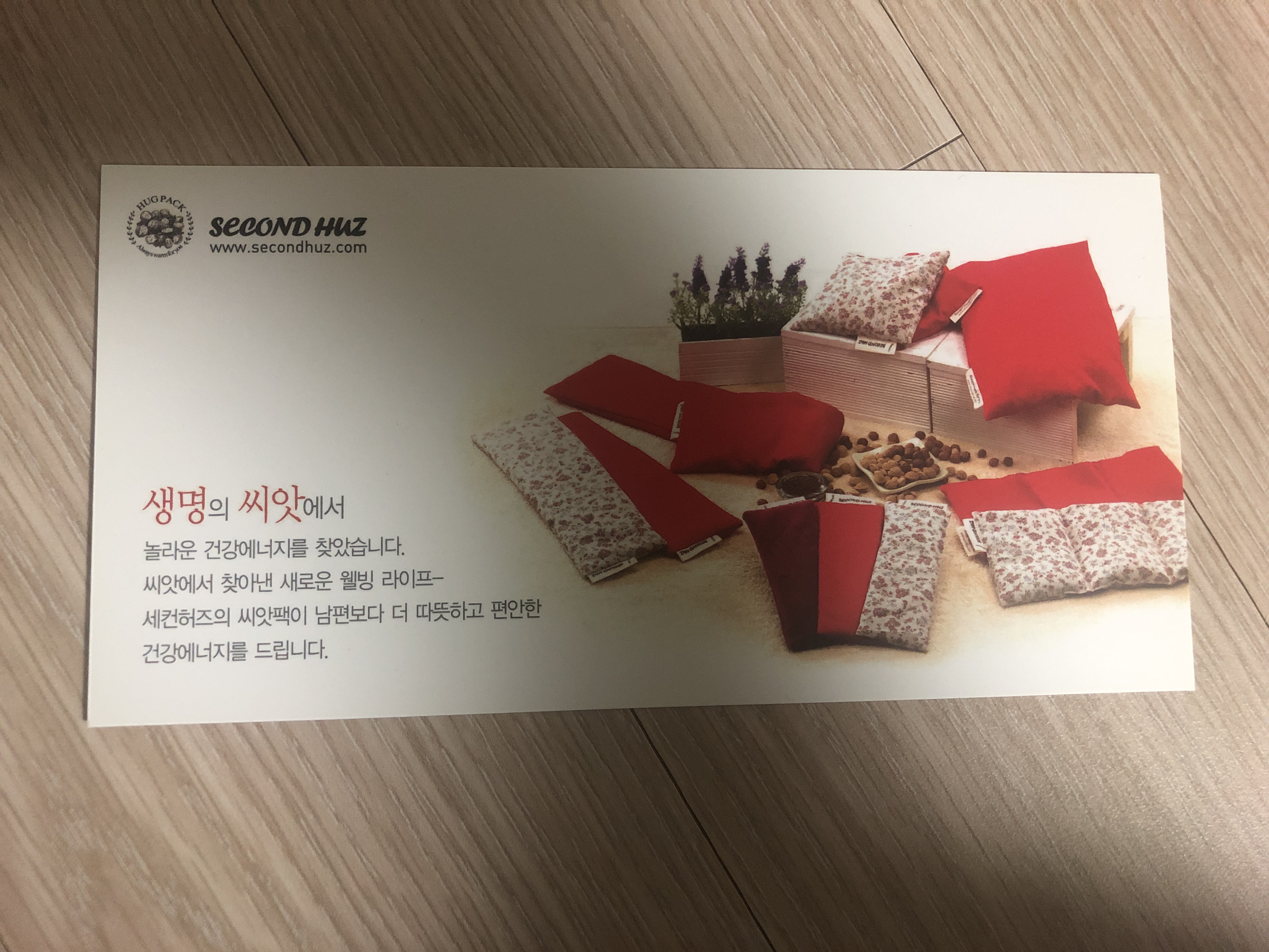 세컨허즈 찜질팩 종류와 사용설명서가 들어있네요..! 숄더팩 허그팩 등등 여러가지가 있네요..! 가격은 사진을 참고해주시구요~! 사용방법이 이렇게 적혀 있습니다. 전자렌지에 넣고 가열하시면 되는데요~! 사용방법이 참 간단해서 좋네요..! 눈찜질팩은 30~40초, 코지팩 넥타임 팩은 1분, 스마트팩/숄더팩/손목찜질팩은 2분, 허그팩은 3분..! 가정용 600w 전자렌지 기준입니다. 출력이 높은 전자렌지는 30초 단위로 테스트 후..! 사용하라고 나와 있습니다. 제품을 비닐에 넣어 냉동실에 넣어두시고 냉찜질용으로 사용하셔도 된다고 합니다. 유의사항은 절대 물세탁을 하지말라는 것..! 씨앗으로 되어 있어서 물세탁을 절대 하지말라고 하네요..!!