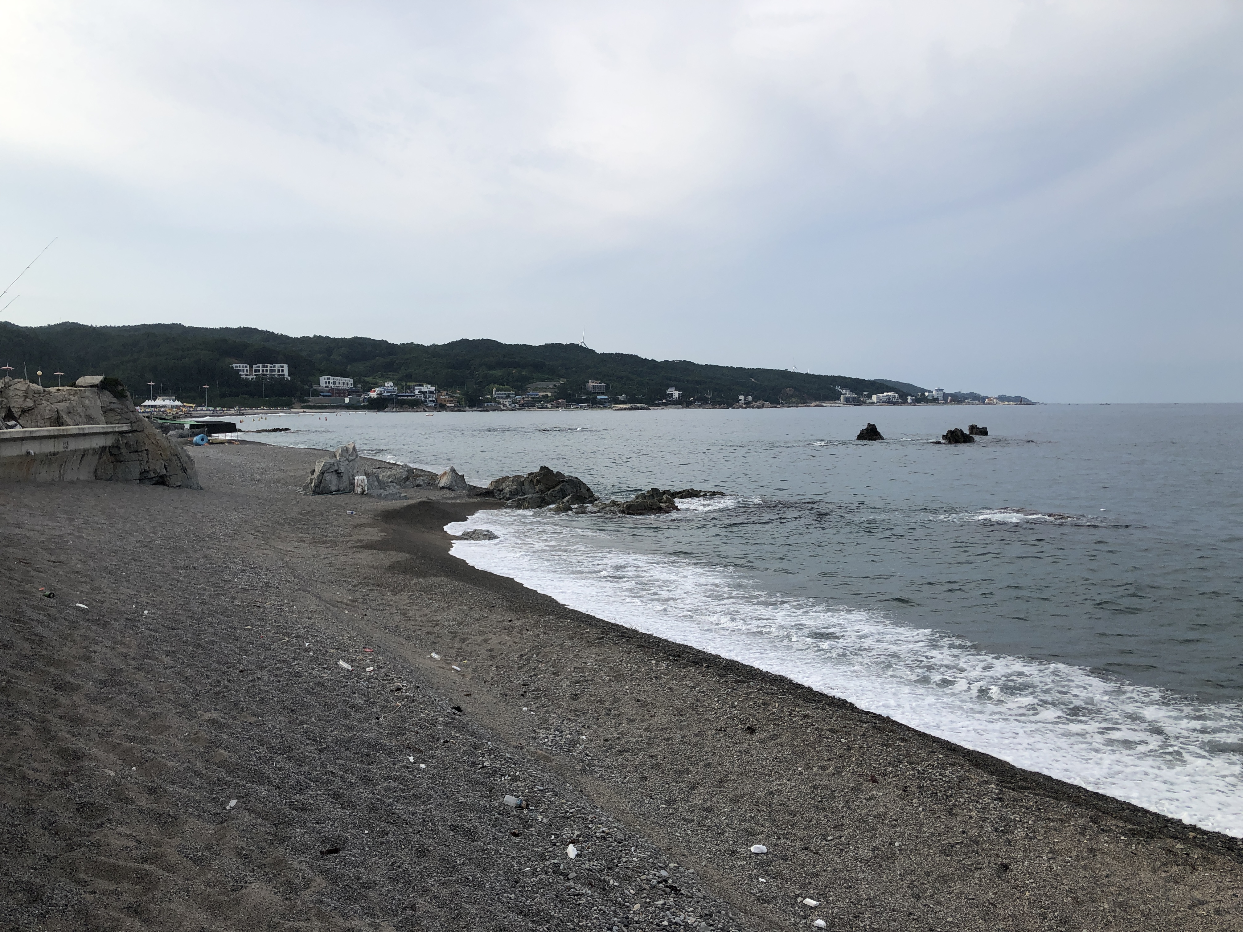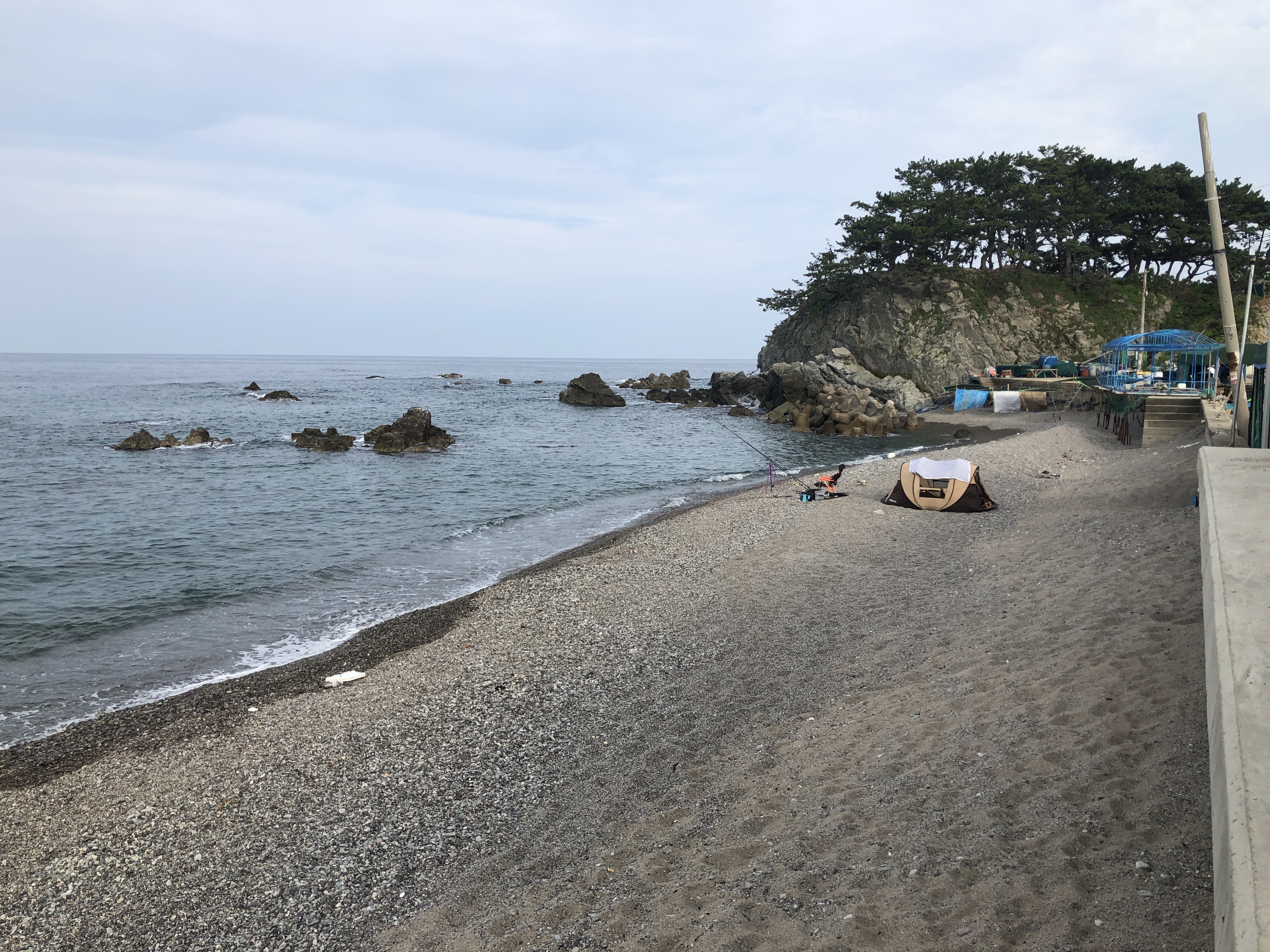 낚시하는분이 보이시네요~! 펜션 바로 앞으로 걸어가면 해수욕장이라 낚시가 금지에요~! 해수욕장을 보고 오른쪽으로 걸어나오시면 요런 자리가 있는데~! 여기가 낚시꾼들에게 유명한 포인트라고 하는데.. 창바위포인트인가 뭔가.. 하이튼 여기에 낚시를 하기로 하고..!! 아버지께서는 오른쪽 갯바위 위에 올라가서 하신다고 하네요 ㅎㅎ