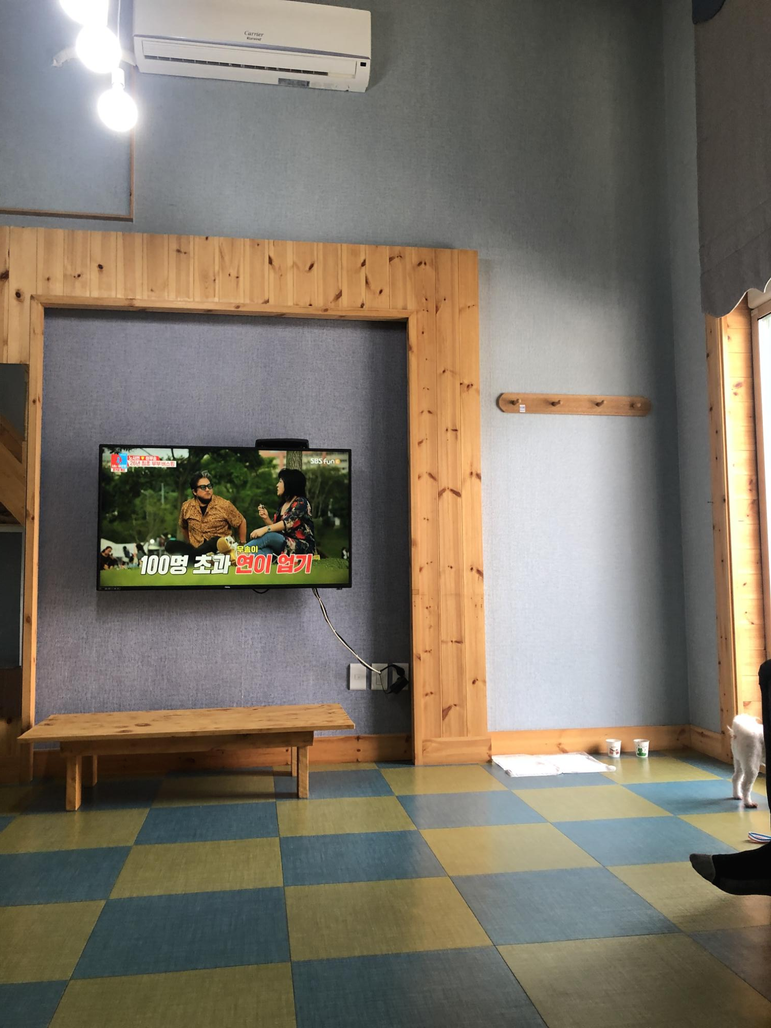 포시즌펜션의 쇼파에 앉아서 찍은 티비와 에어컨 모습..! 저희 별이의 패드와 물과 사료가 담긴 종이컵도 보입니다. 한 2년전에 포항 칠포쪽과.. 작년에 월포쪽에 펜션에 갔을때 살짝 오래된 방의 냄새? 가 났었는데 여기는 깔끔하네요. 처음에 체크인을 하는데 아주머니께서 바다뷰가 보이는 방을 줄려고 했다고 하는데.. 바다가 보이나 싶긴하던데.. ㅎㅎ 바다뷰는 크게 기대 안하시는게 좋을 것 같아요..!! 하이튼 포시즌펜션 방은 깨끗하다는 것..!!