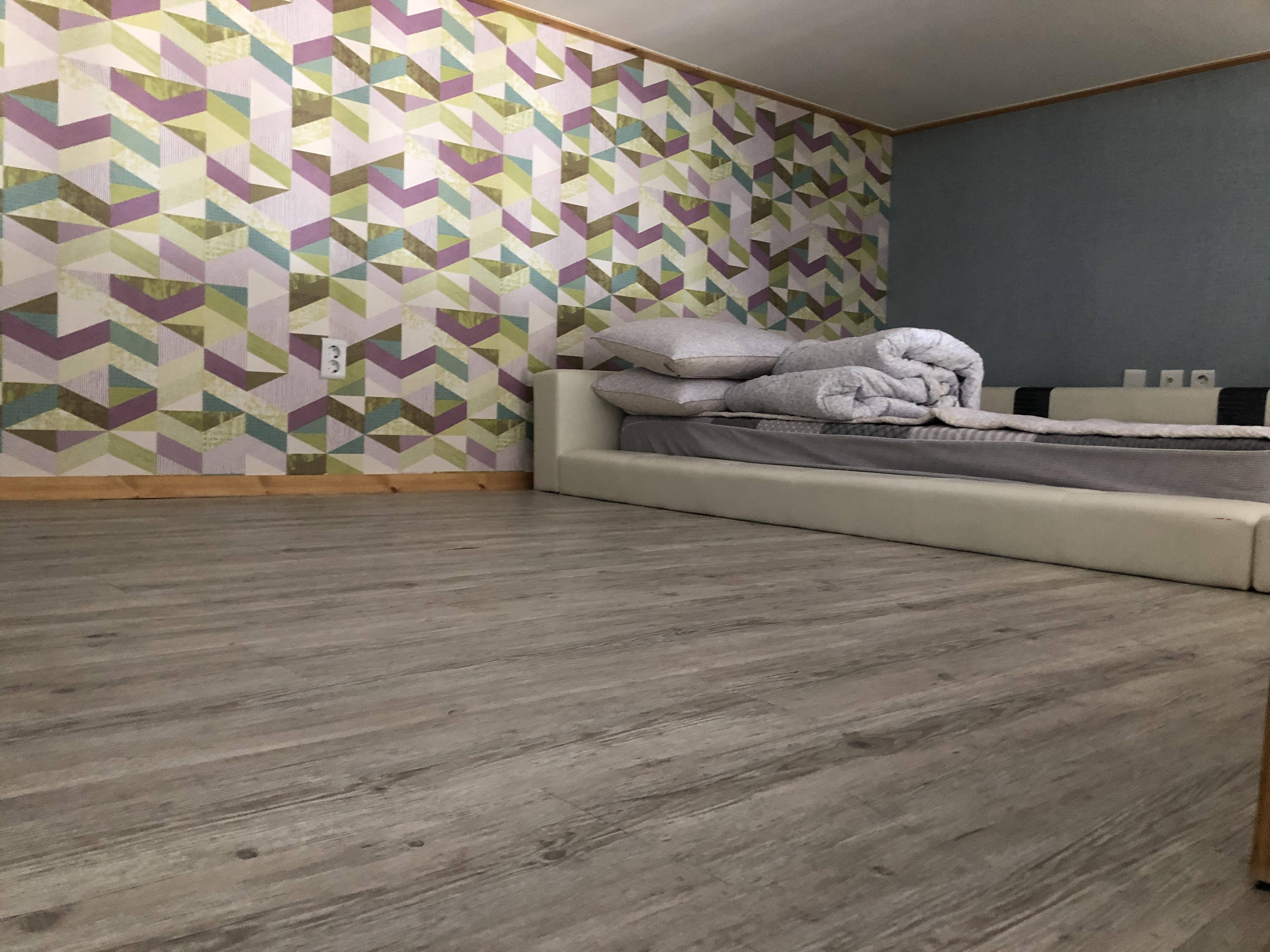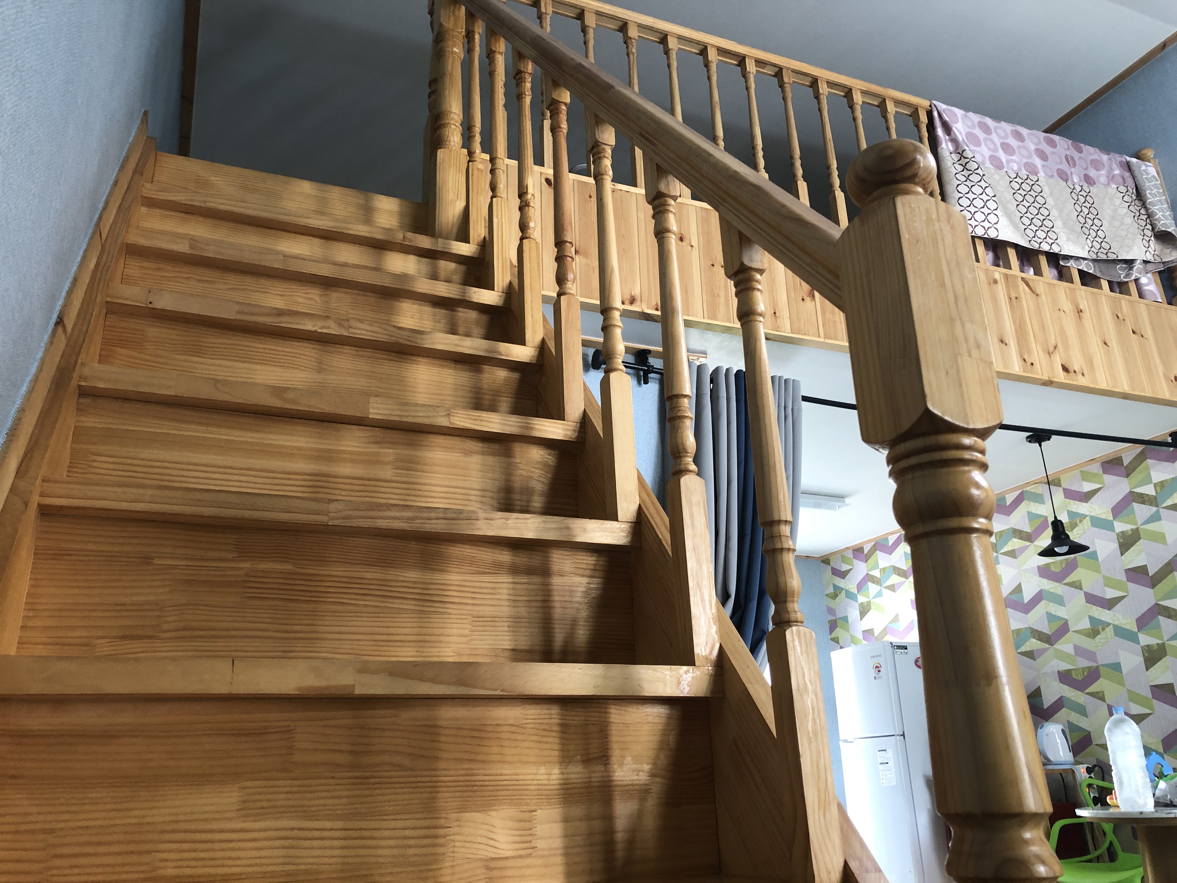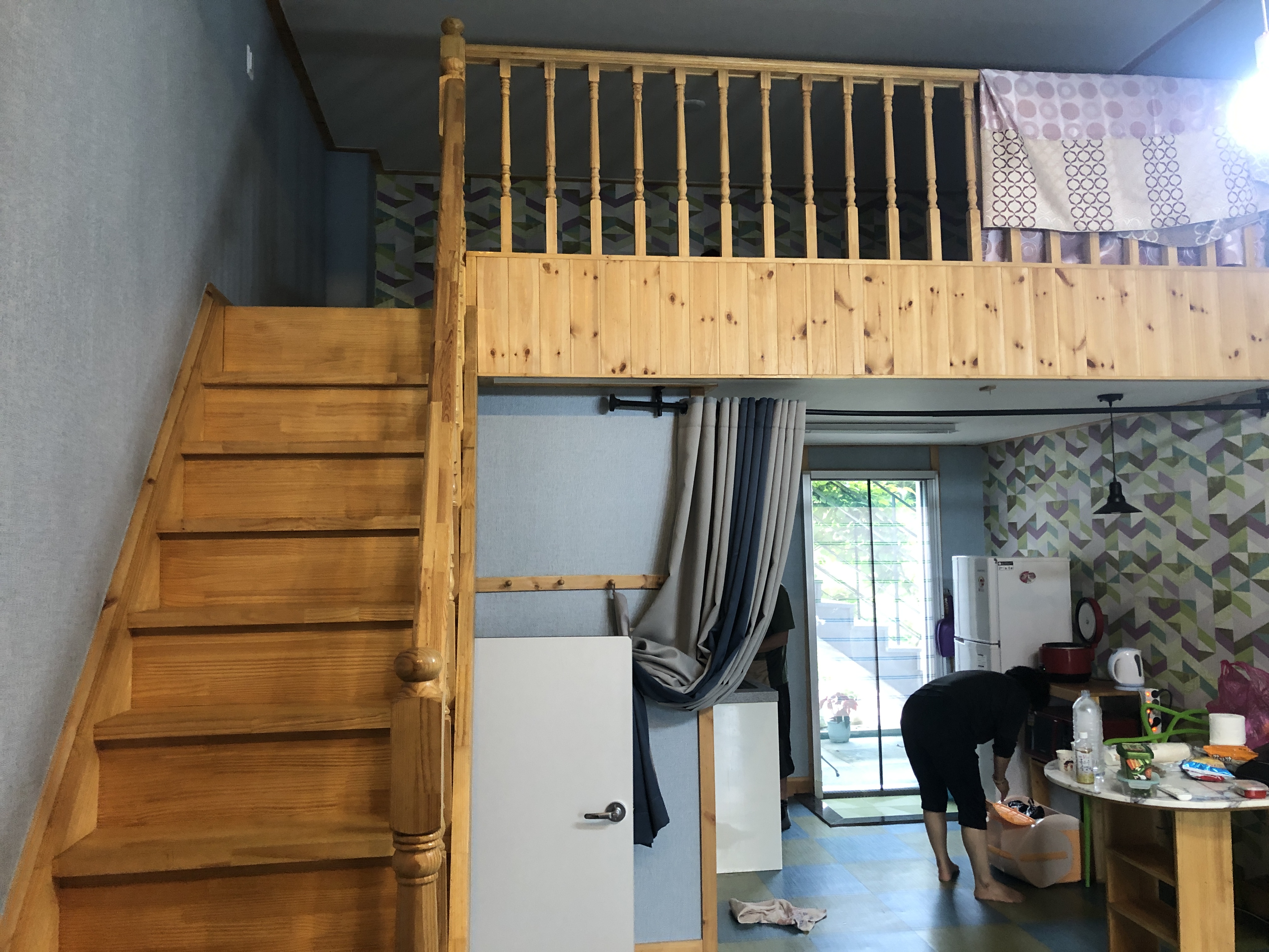 딱 처음모습을 찍지는 못해서 양해좀 드릴게요~! 저희가 짐풀고 사진 찍었어요.. ㅠㅠ 전체적인 모습입니다. 저희는 a101호 사용했구요~! 방은 따로 없고 이렇게 복층입니다. 따로 방이 없어서 조금 불편하긴했는데. 그래도 괜찮았어요. 계단의 높이는 살짝 높은편이구요~! 침구에 따로 냄새도 안나네요.