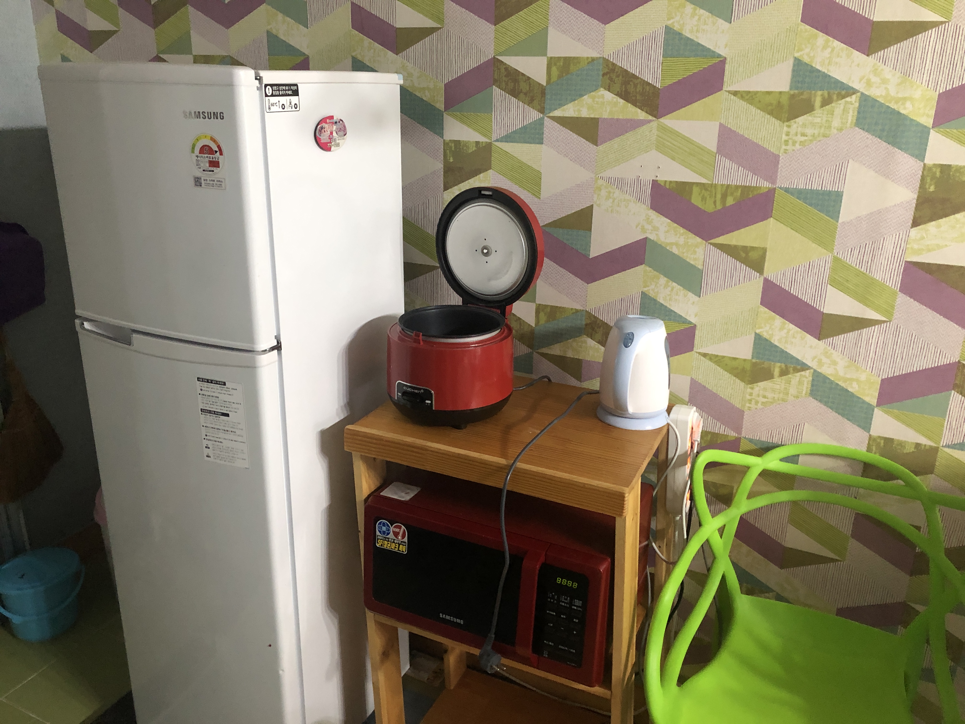 냉장고, 커피포트, 밥솥, 전자렌지, 인덕션이 보입니다. 저기 고추장통은 저희가 다 먹고 치울려고 했던거에요 ㅎㅎ 사용전을 찍었어야 되는데 사용후를 찍어서..ㅠㅠ ㅎㅎ 냉장고가 작아서 저희가 조개를 죽도시장에서 사왔는데 냉장고에 넣지를 못함.. 물론 얼음팩에 담아왔는데 살짝 걱정이 ㅠ_ㅠ.. 3시에 체크인을해서 좀 있으면 대충 둘러보고 짐풀고 바다로 나갔어요..!!