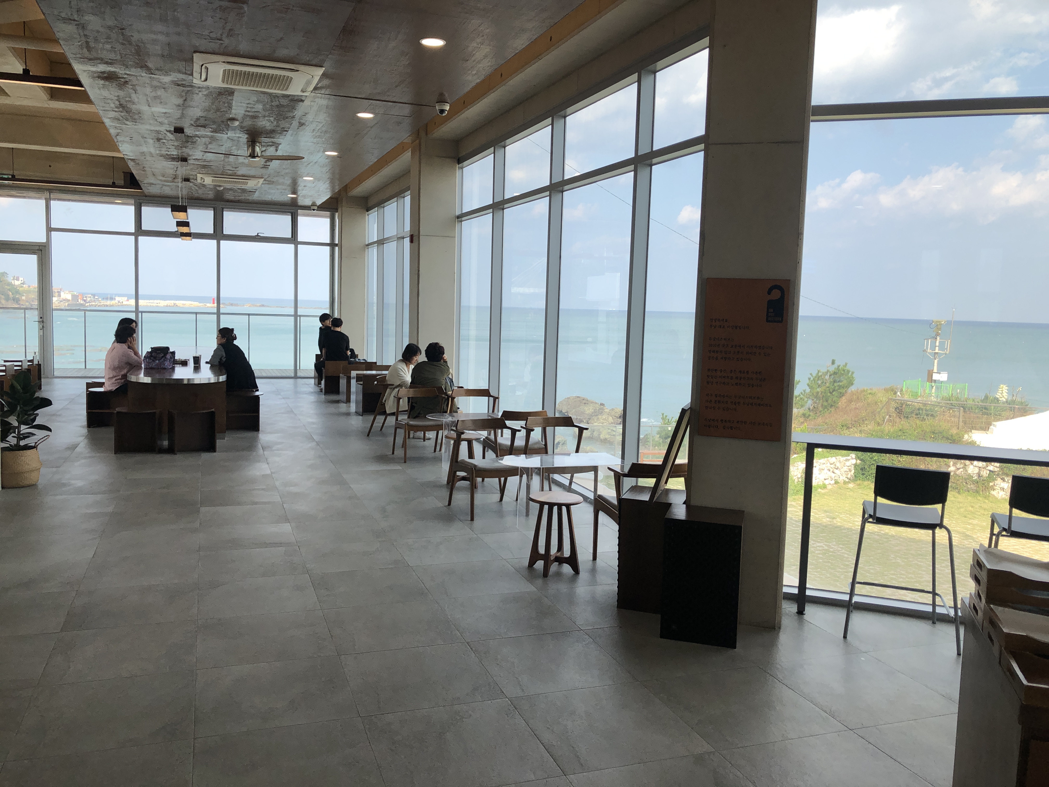 딱 들어가자말자 계산대 앞에서 바다를 보고 찍은사진입니다. 내부는 엄청 심플하고 고급지고 깔끔하네요. 날씨가 좋아 밖에 바다도 한눈에 다보이고.. 굉장히 멋진 카페라는 생각이 들었습니다. 근데..! 근데.. 근데..! 하나 단점이 있네요~~