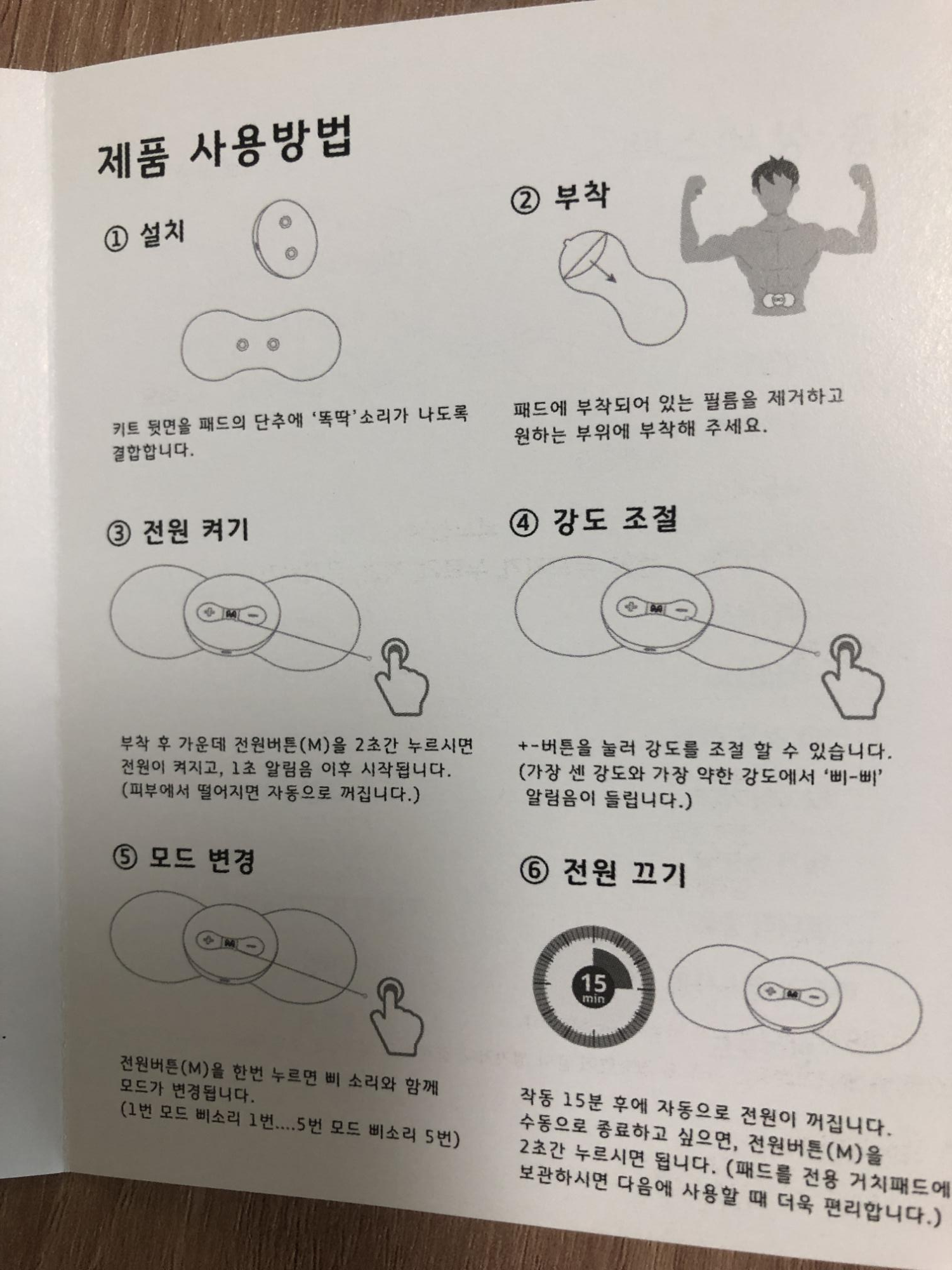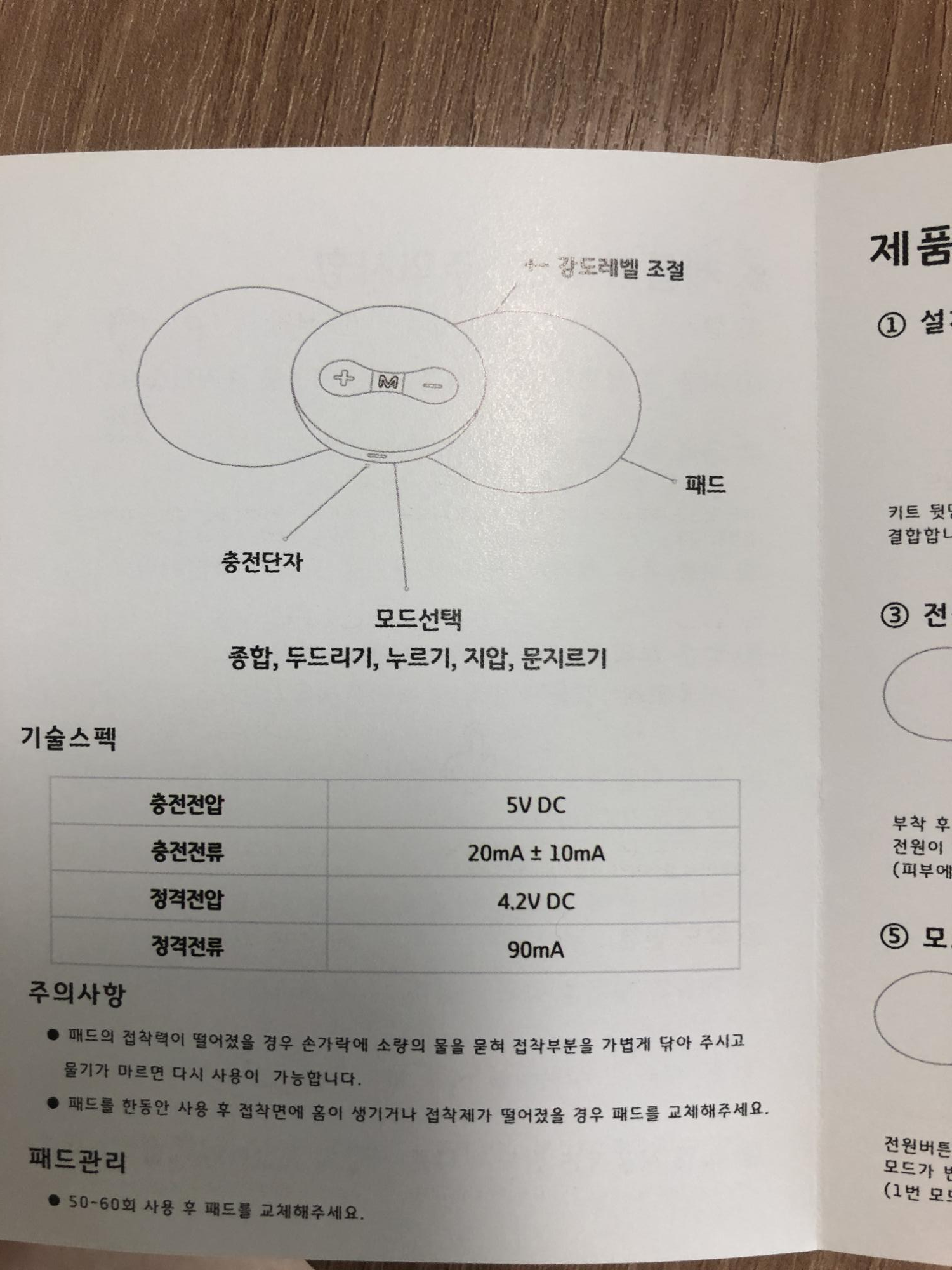 사용설명서는 간단해요~! 모드는 중간에 M 으로 바꾸시면 되요. 종합, 두드리기, 누르기, 지압, 문지르기가 있습니다. 저는 종합으로만 사용해요..! 느낌은 진동으로 표현을 해볼게요~! 두두두두두두두두두두 두 두 두 두 두 두 두 두 두 두 두 두 두 두 두 두두두두두두두 이런느낌..? 참 말로 표현하기 어려운데 천천히 왔다가 빨라 졌다가를 반복하신다고 보면됩니다. 강도는 +와 - 를 누르시면 되는데 모드를 바꿀때마다 다시 강도를 설명해주셔야되요. 강도는 저는 3~4가 딱 맞더라구요. 사람마다 차이는 있으니 사용해보시고 선택하시면 될 것 같습니다. 가장 약한 강도나 강한 강도는 삐 ~ 삐 소리가 두번이 납니다. 그냥 누를땐 한번 나구요~! 그렇게 아시면 될 것 같습니다. 다른 상세 스펙은 설명서를 참고하시길 바랍니다.