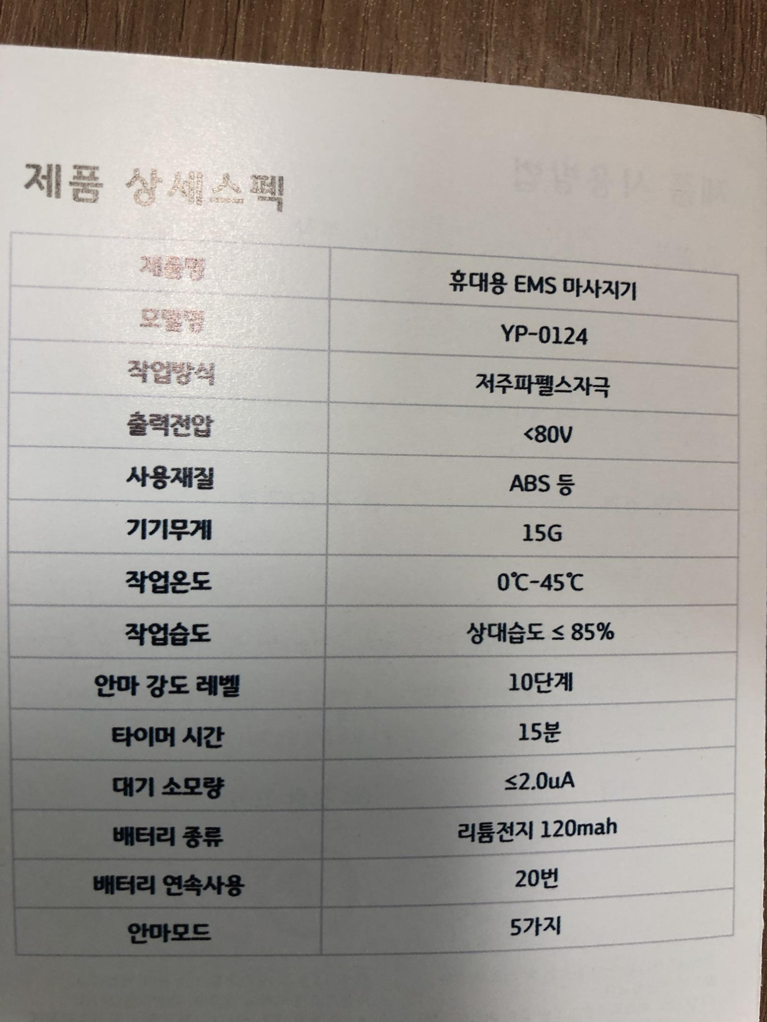 사용설명서는 간단해요~! 모드는 중간에 M 으로 바꾸시면 되요. 종합, 두드리기, 누르기, 지압, 문지르기가 있습니다. 저는 종합으로만 사용해요..! 느낌은 진동으로 표현을 해볼게요~! 두두두두두두두두두두 두 두 두 두 두 두 두 두 두 두 두 두 두 두 두 두두두두두두두 이런느낌..? 참 말로 표현하기 어려운데 천천히 왔다가 빨라 졌다가를 반복하신다고 보면됩니다. 강도는 +와 - 를 누르시면 되는데 모드를 바꿀때마다 다시 강도를 설명해주셔야되요. 강도는 저는 3~4가 딱 맞더라구요. 사람마다 차이는 있으니 사용해보시고 선택하시면 될 것 같습니다. 가장 약한 강도나 강한 강도는 삐 ~ 삐 소리가 두번이 납니다. 그냥 누를땐 한번 나구요~! 그렇게 아시면 될 것 같습니다. 다른 상세 스펙은 설명서를 참고하시길 바랍니다.