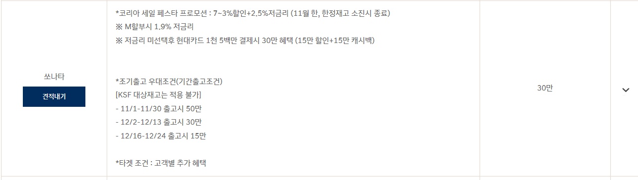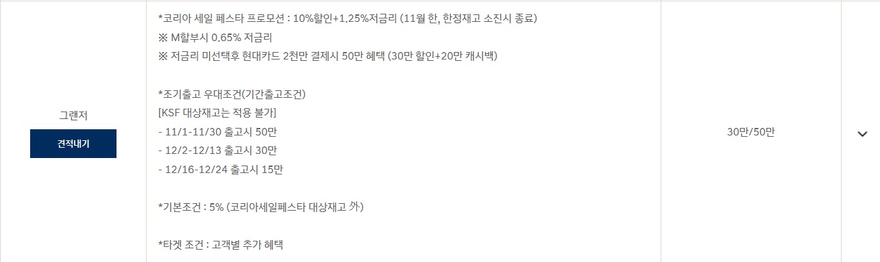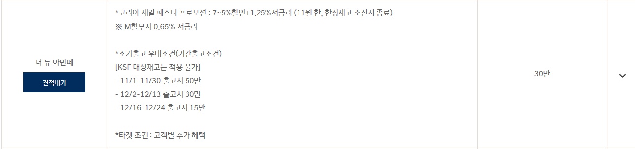 코리아 세일 페스타 프로모션 : 7~5% 할인 + 1.25% 저금리 (11월한 , 한정재고 소진시 종료)