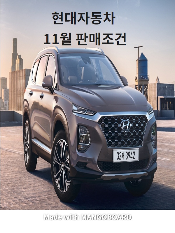 항상 지금쯤이면 노동조합과 회사가 임금협상으로 인해서 여러가지 트러블이 발생하는데 이번은 빨리 끝나서 이런저런 잡음도 없고 연말이 다되어가니 차를 구입하기 좋은 것 같습니다. 그럼 이제 현대자동차의 11월 판매조건을 알아보도록 하겠습니다.