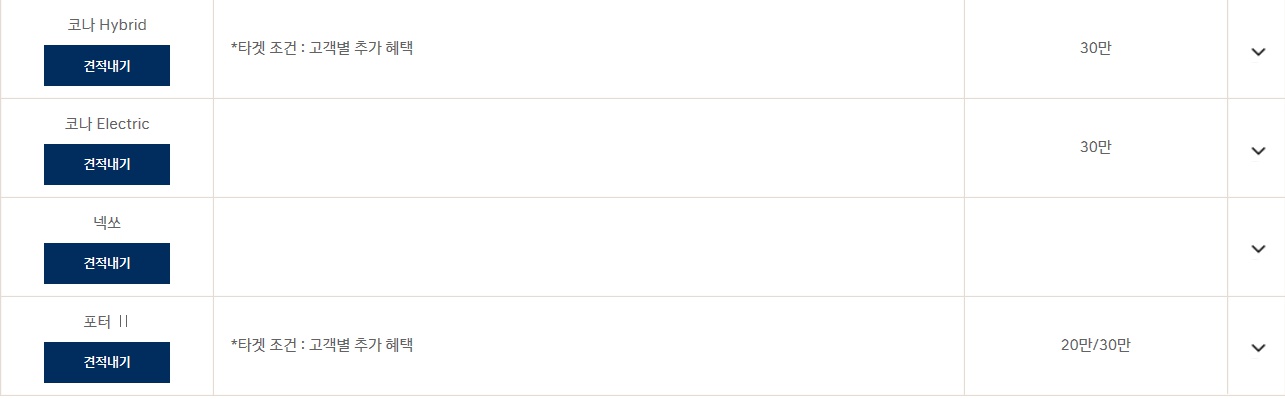 펠리세이드, 스타렉스, 아이오닉 하이브리드, 아이오닉 일렉트릭, 아이오닉 플러그인, 쏘나타 하이브리드, 코나 하이브리드, 코나 일렉트릭, 넥쏘. 포터 전부다 타겟조건만 있네요. 다른 조건은 없습니다..