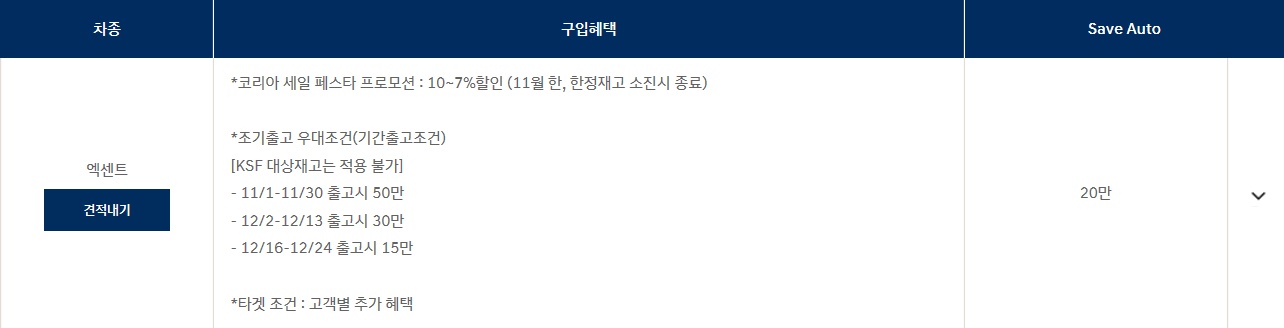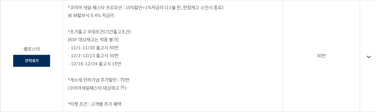 코리아 세일 페스타 프로모션 : 7~5% 할인 + 1.25% 저금리 (11월한 , 한정재고 소진시 종료)