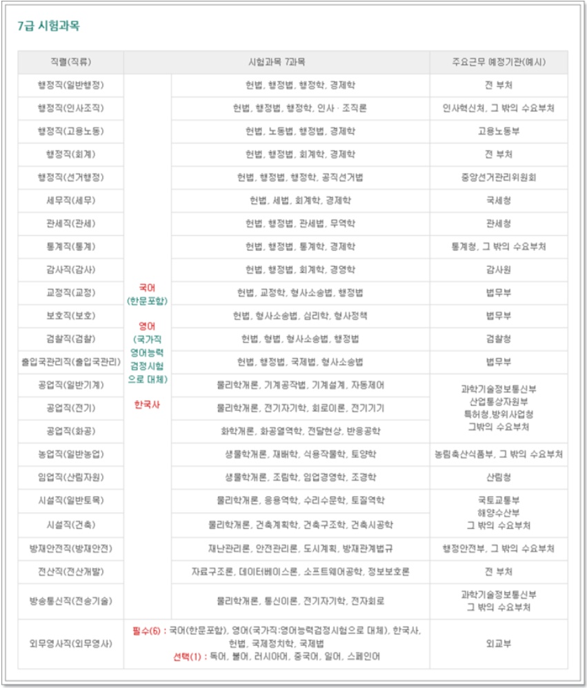 7급의 경우 9급과 연령과 과목등 차이가 있는데요~! 20세 이상 응시가 가능합니다. 9급은 18세 이상부터 가능하다고 하네요~! 과목도 9급과는 달리 총 7과목을 응시한다고 합니다. 7급 국가직 공무원은 국어, 한국사 + 영어능력 검정시험 + 지정 4과목(직렬별로 다름) 7급 지방직 공무원은 국어,한국사,영어,지정 4과목(직렬별로 다름)입니다. 그리고 7급 국가직 공무원의 경우 영어과목이 영어능력시험으로 대체 되어 실제 영어시험을 응시하지 않는다고 합니다. 이상으로 2020년 공무원 시험일정과 9급공무원 시험과목, 7급공무원 시험과목을 알아보았습니다.