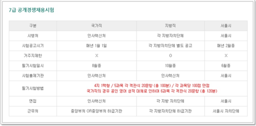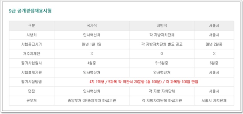 2020년 공무원 9급,7급 공개경쟁채용시험인데요~! 국가직과 지방직 서울시로 나눠져 있네요. 시행처는 국가직은 인사혁신처, 지방직은 각 지방자치단체, 서울은 서울입니다. 시험공고시기는 국가직은 매년1월1일, 지방직은 지방자치단체 별도 공고, 서울시는 매년2월중에 하고 있습니다. 거주지 제한은 지방직만 있구요~! 필기시험은 국가직은 4월중, 지방직은 5~6월, 서울은 6월중에 시행됩니다. 필기시험 방법은 4지1택형, 5과목에 20문항 총 100분입니다. 면접도 국가직은 인사혁신처, 지방직은 각 지방자치단체, 서울은 서울시에서 하게되고 근무처는 국가직은 중앙부처 or중앙부처 하급기관, 지방직은 지방자치단체, 서울시는 서울 자치단체입니다.