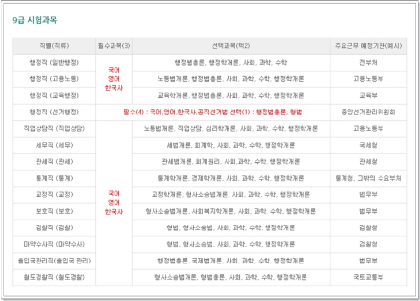 2020년 공무원 9급 시험과목