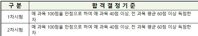 ㅁ합격 기준은 1차 시험 2차시험 둘다 같습니다. 매 과목을 100점 만점으로 하여 과목 40점 이상, 전과목 60점 이상을 득점해야 된다고 합니다. 1과목치는 시험은 60점 이상되어야 됩니다. 만약 2과목을 시험치는 경우에는 한과목은 최소 40점 합쳐서 60점은 되어야 됩니다. 그 말은 한과목이 40점 맞으면 다른과목은 80점이 되어야 합격한다는 것입니다. 또 다른 예로 한 과목을 90점 맞고 다른과목을 39점 맞으면 불합격입니다. 과락이라는 것이죠..!