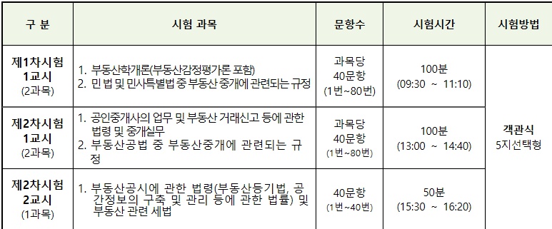 공인중개사 시험과목 및 방법입니다 1차시험과 2차 시험이 있습니다. 모두 40문항으로 1차시험 1교시, 2차시험 1교시는 2과목씩 시험을 치는데 100분씩 주어집니다. 하루에 1차2차 시험을 다보시는분들은 오전에 시험을 치기 시작하여 중간에 비는 시간을 제외하고 다 끝나면..오후 4시 20분입니다. 문제는 객관식으로 5지 선택형입니다. 만약 1차 시험통과후 2차시험에 떨어지면 다음 회차에 한하여 1차시험 면제고 2차시험만 칠 수 있습니다. 또 불합격이 된다면 그 다음해에는 다시 1차 시험과 2차 시험을 치뤄야 됩니다.