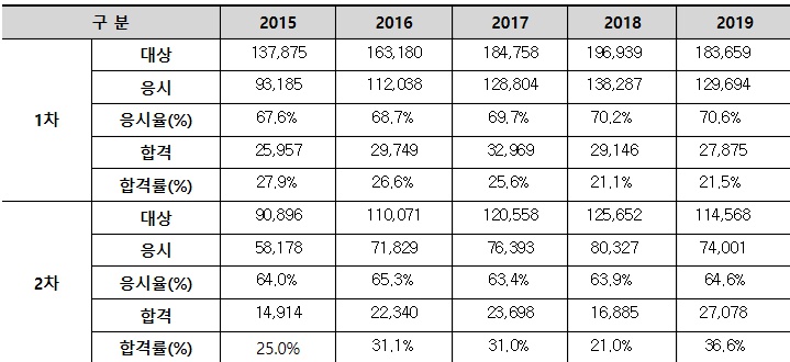 공인중개사 시험은 일년에 한번 치는 시험이다 보니 응시인원이 많습니다. 표를 보시면 매년 증가하다 19년에 조금 줄어드는 모양입니다. 11년서 14년 사이에는 6~7만명 정도 지원했는데 부동산이 뜨면서  응시인원이 증가했습니다. 이상한 점은 응시인원은 많은데 실제로 응시하시는분들은 많아야 70%네요~! 응시비용이 싸서 그런가.. 많이 불참하네요. 합격률은 19년도 기준으로 21% 쉽게 볼 자격증은 아니네요~! 모두 열심히 공부하셔서 내년에는 좋은 소식 들었으면 좋겠습니다.