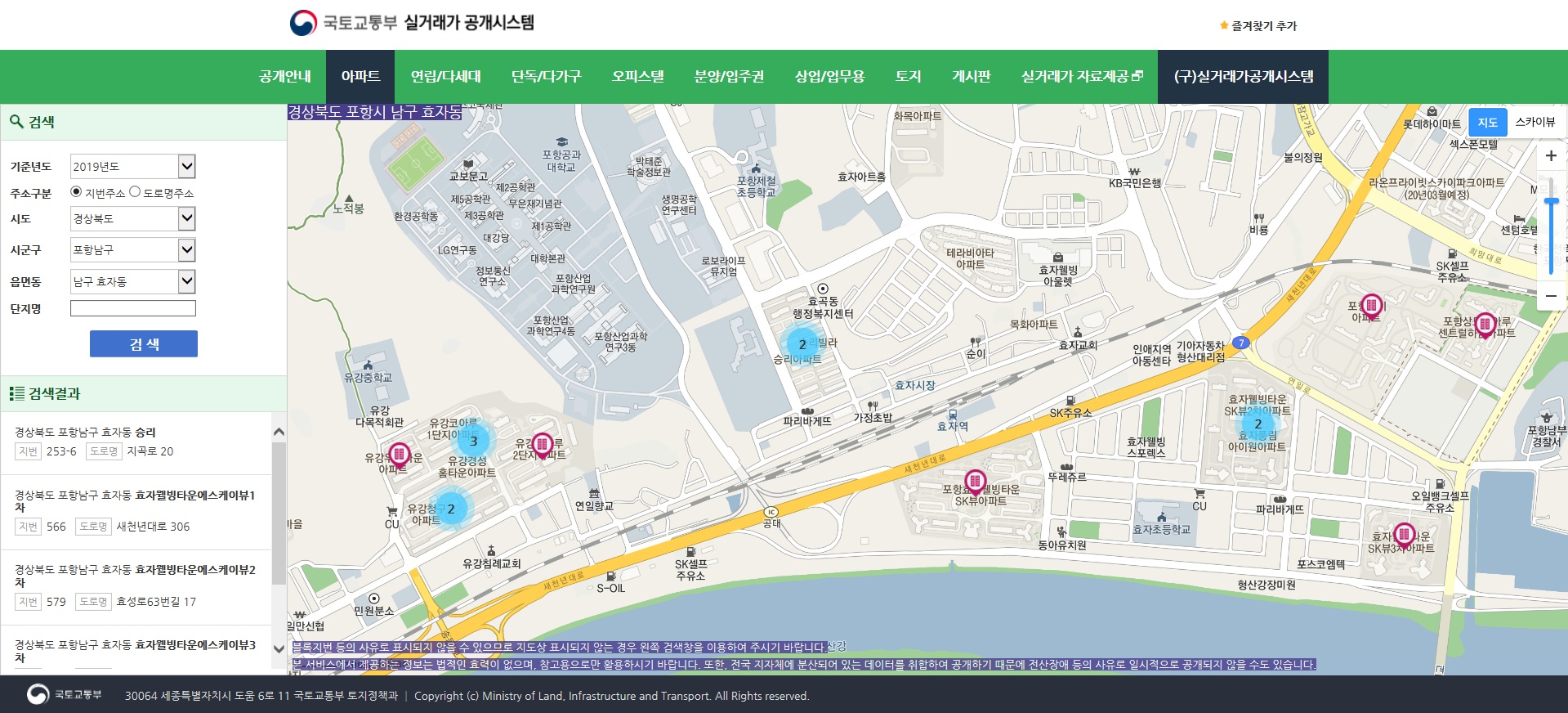 아까 말씀드렸듯이 경상북도 포항 남구 효자동으로 검색하니까 여러가지 아파트가 2019년도에 거래가 된 횟수별로 지도에 표시가 되고 있습니다. 왼쪽 밑부분에는 실제 거래가된 아파트 이름이 보이는데요~! 유강 코아루 단지도 매매가 이루어졌고 승리아파트 sk뷰 아파트도 거래가 이루어졌네요..! 한번 확인해보겠습니다.