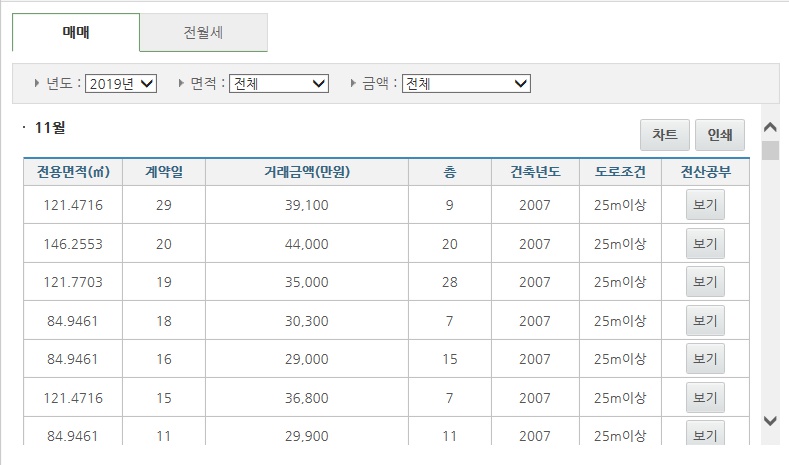 검색결과는 이런식으로 나옵니다..! 전용면적은 얼마인지, 매달 계약일은 언제이고 거래 금액 층수, 아파트의 건축년도까지 다 나옵니다. 보통 사람들은 로열층이라해서 아파트가 남향이고 중간층 이상부터 고층전까지 선호하고 그 중에서도 전망이 좋은 그런집을 선호하기 때문에 실제 그층의 거래가격이 좀 오를수도 있어요..! 그래서 저층과 고층 여러가지 참고하셔서 보시면 될 것 같습니다.