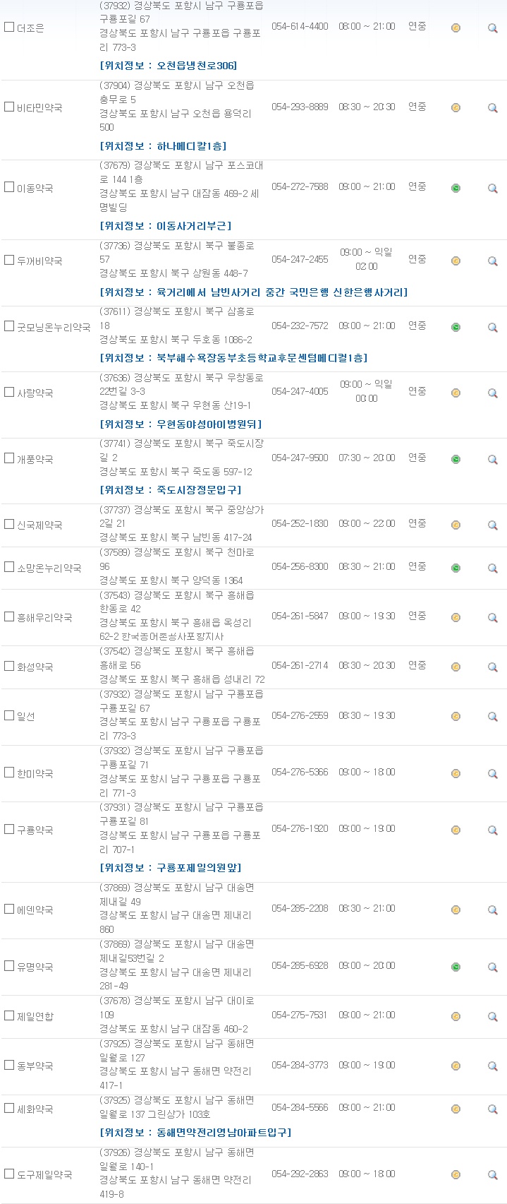 경상북도 포항시 북구까지 입력을 완료하였고 뒤에 동을 안넣으니 검색이 안되더라구요..! 제가 포항에 있는 우현동, 학산동, 장성동까지 입력을 해봤는데 약국이 안뜨더라구요..! 아마도 연중무휴약국은 없나봅니다 ㅠ_ㅠ.. 이튼저튼 이런 검색방법도 있다는 것..!!