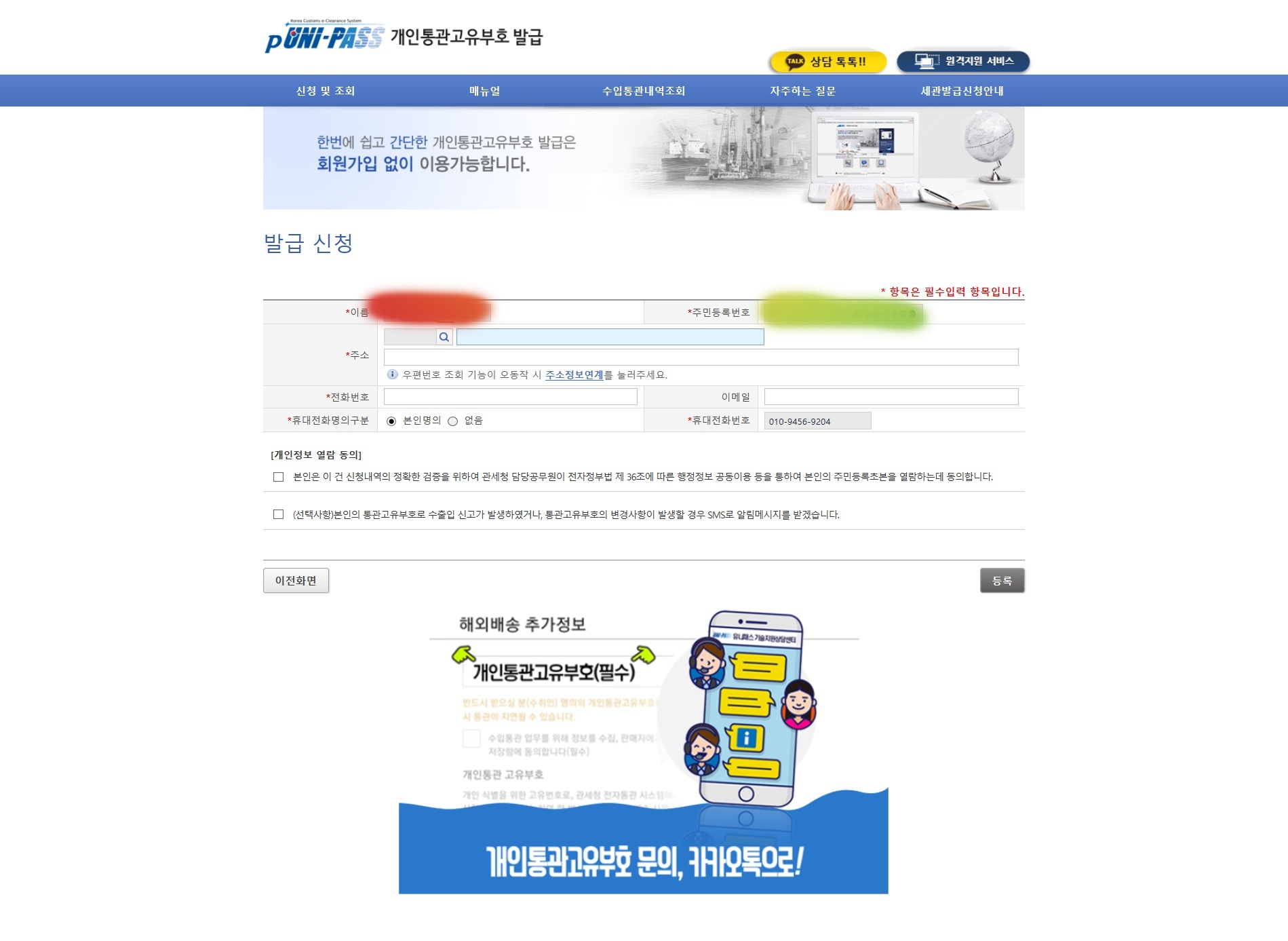 핸드폰 사진으로 찍어서 화질이 안좋은데 양해부탁드릴게요. 성명과 주민등록번호를 치면 이런화면이 나옵니다. 저는 아직까지 한번도 직구를 해본적이 없습니다. 조회먼저 해보니까 없다고 나오네요..! 그래서 이번에 새로 한번 받아보자~해서 발급을 눌렀습니다..! 개인통관고유부호 신규발급..!!
