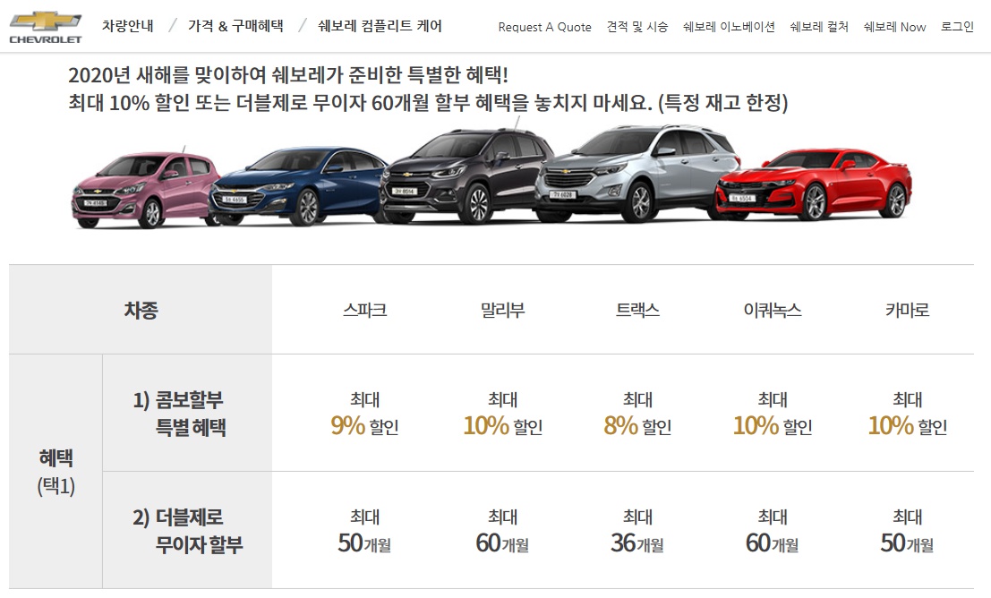 2020년 새해를 맞이하여 쉐보레가 준비한 특별혜택입니다. 최대 10% 할인 또는 더블제로 무이자 60개월 할부 혜택이 있다고 합니다. 스파크는 최대 9%할인 할부 50개월, 말리부는 최대 10%할인, 60개월 할부, 트랙스 8%할인 36개월 할부, 이쿼녹스 10%할인 60개월 할부, 카마로 10%할인 50개월 할부입니다.