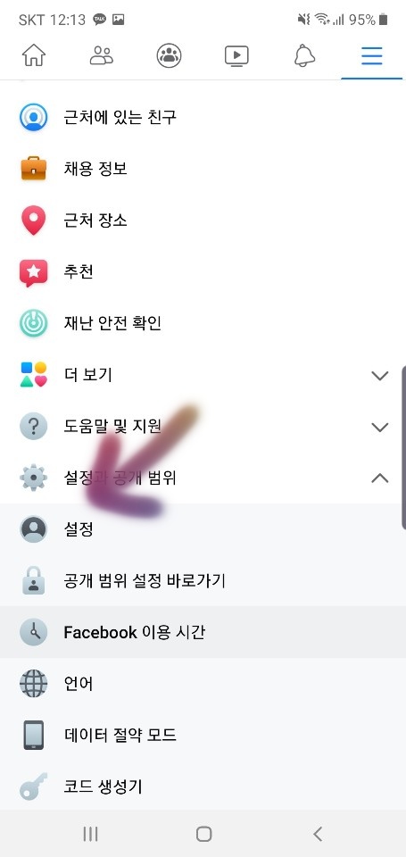 일단 페이스북앱을 킨 다음에 메뉴에 들어가시면 됩니다.