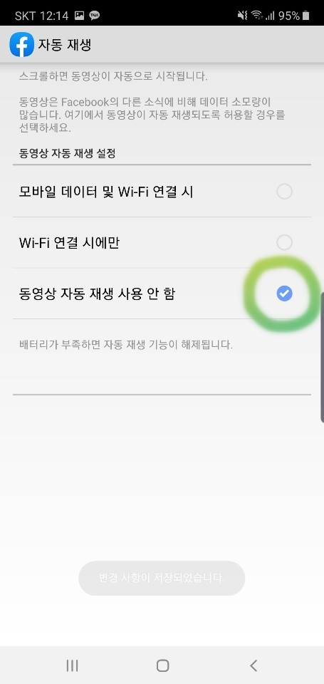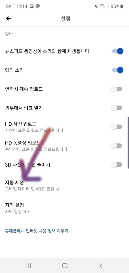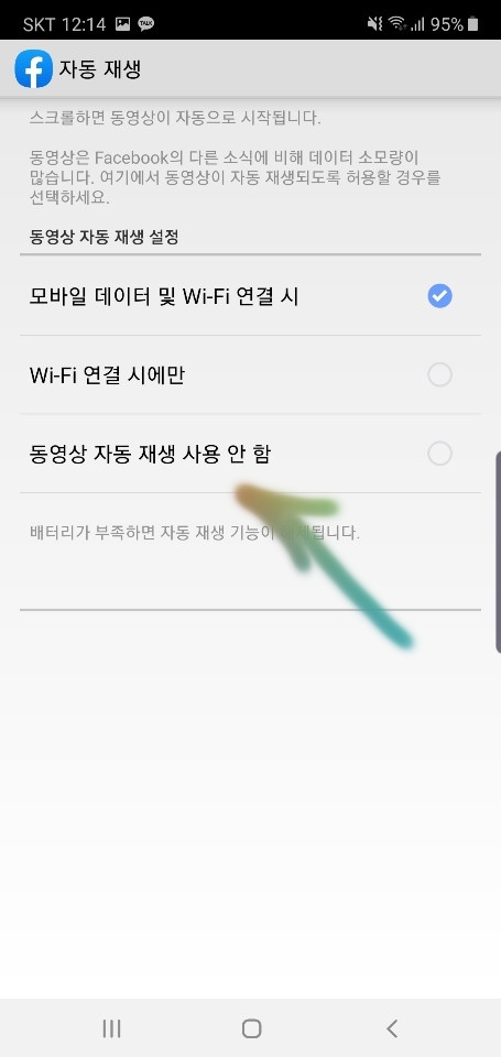 자동재생에 설정이 3가지가 있습니다. 모바일 데이터 및 와이파이 연결시