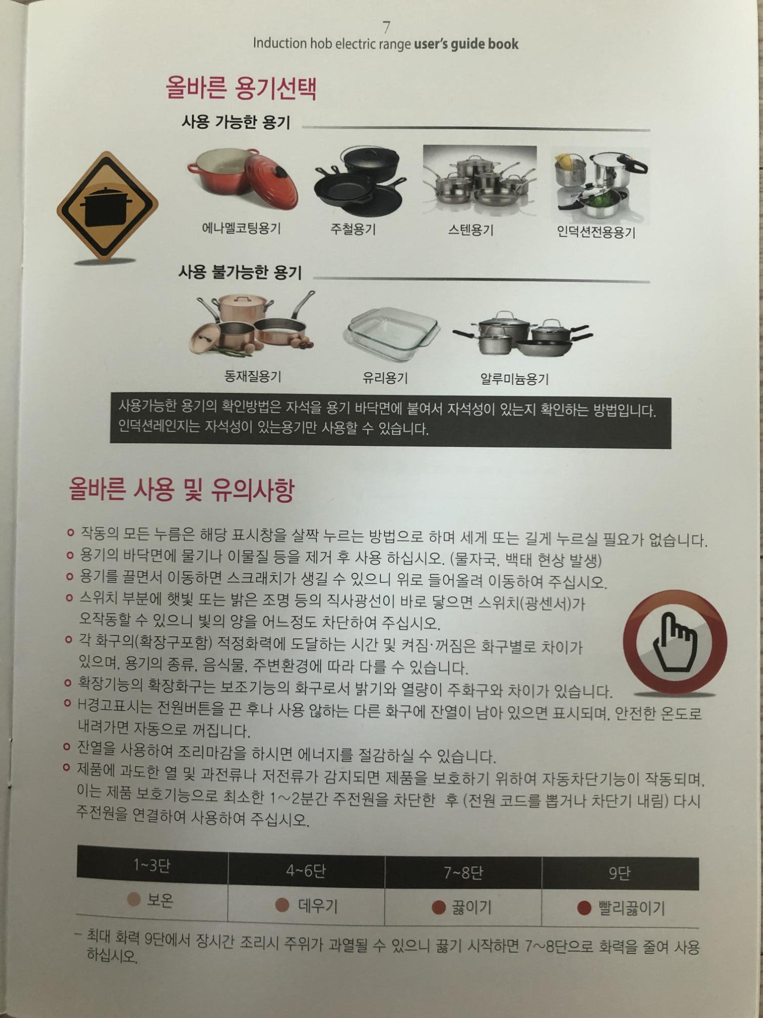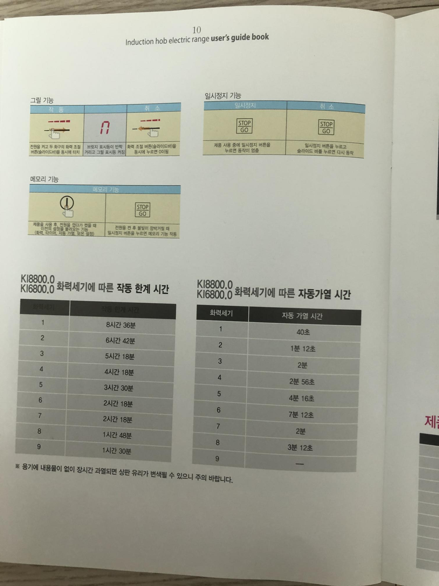 이건 각 화력별로 작동 한계시간과 자동가열 시간이네요. 그냥 참고해주시면 될 것 같습니다. 내용물이 없이 장기간 과열하면 상판 유리가 변색이 될 수 있다고 하니까 조심하시길 바래요..!!
