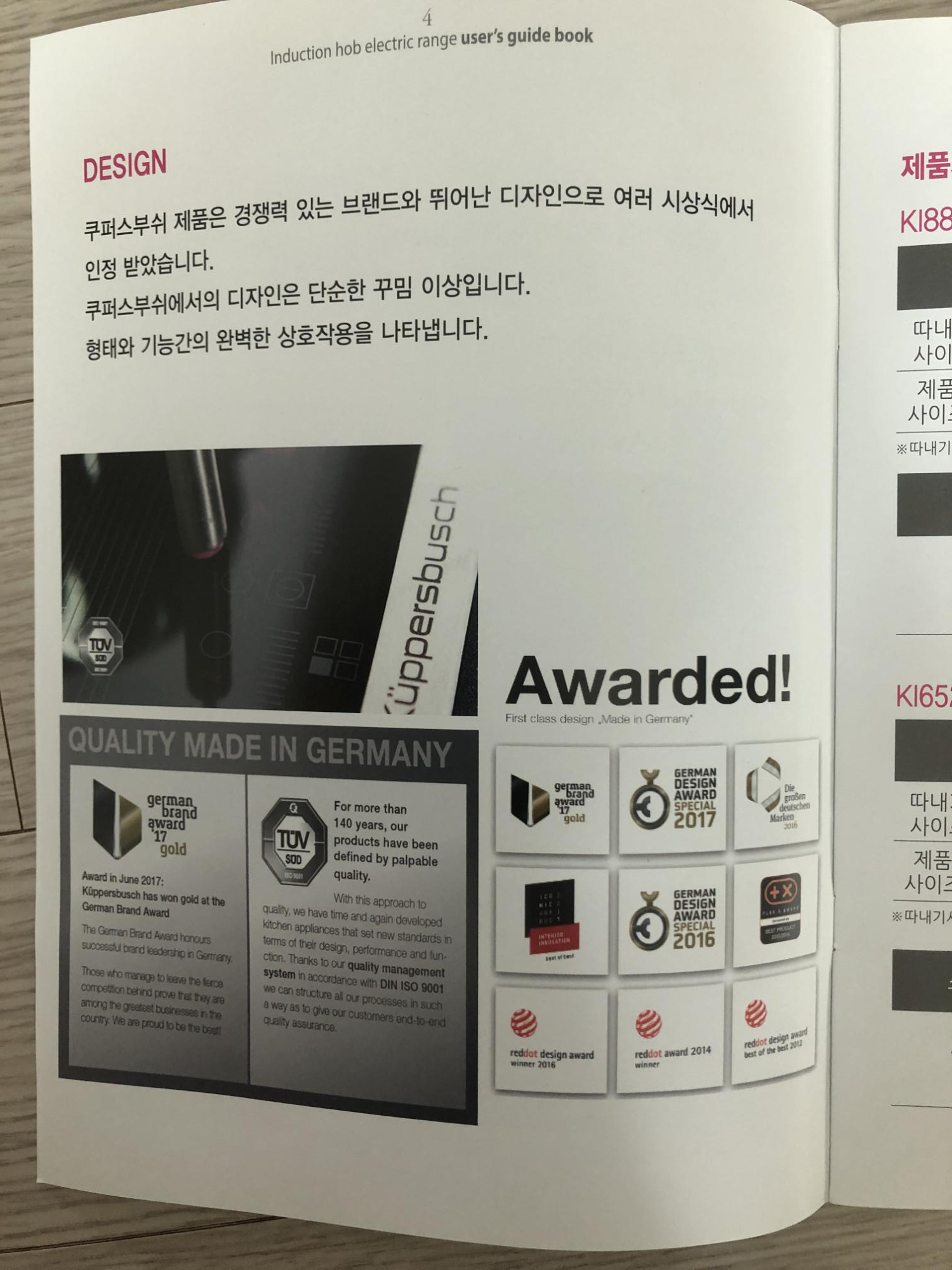 계속 쿠퍼스 부쉬에대한 자랑을 하네요. 브랜드와 뛰어난 디자인으로 여러 시상식에서 인정을 받았다고 합니다. 그리고 제품의 사양이 나옵니다. 제가 구입한 쿠퍼스부쉬 인덕션의 사양은 KI6800.0GR 입니다. 타공을 할 사이즈가 나와 있으니 혹시나 리모델링을 하셔서 인덕션을 설치한다고 하시면 이 사이즈로 타공을 해달라고 하시면 될 것 같아요..!