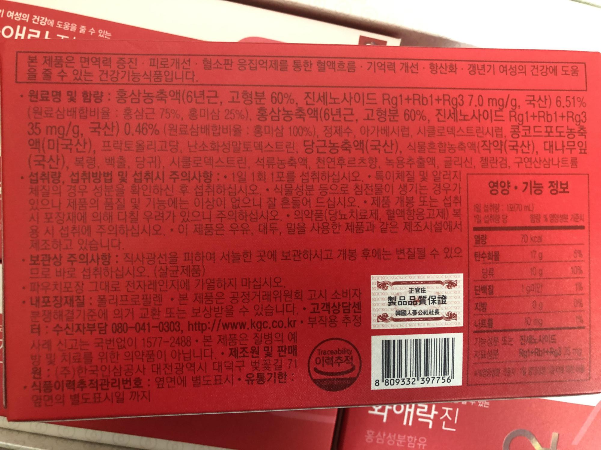 상자를 뜯어보니 이렇게 생겼습니다. 건강기능식품이고, 홍삼성분이 함유디어 있다고 합니다. 갱년기 여성의 건강에 도움을 줄 수 있다고 하는데요. 하루에 한포씩 한달치 입니다. 한달치고.. 가격이 엄청나죠?? 근데 효과만 있다면 상관없을텐데 없으면..좀 그렇네요. 물론 사람마다 틀리겠죠??