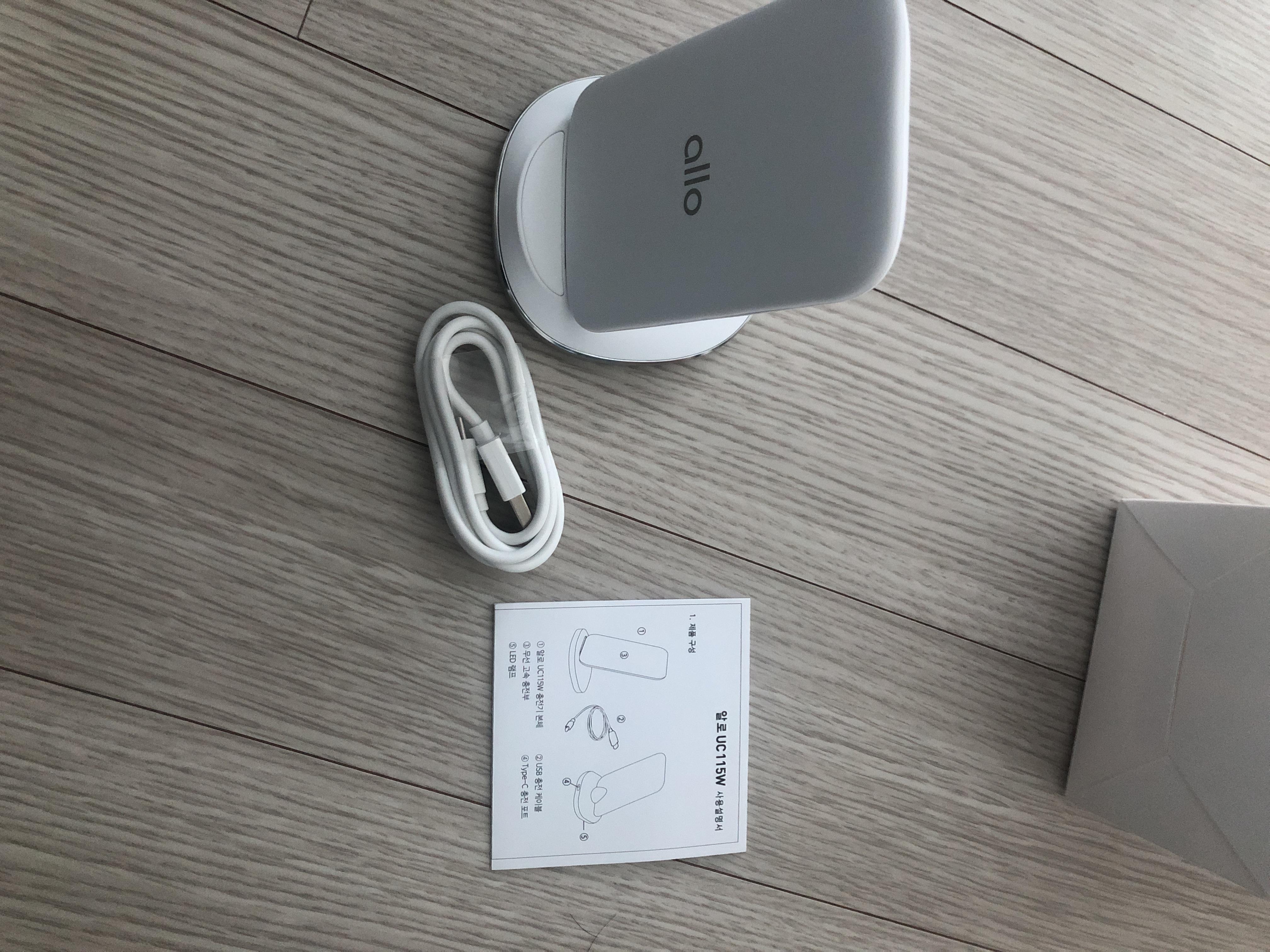 알로 무선충전기의 구성품입니다. 충전케이블은 있는데 충전어댑터는 없어요. 고속충전이 되는 어댑터가 있어야지만 고속충전이 가능하다고해요..! 요즘 배터리 용량이 커서 고속충전을 안하면 느려서 좀 그래요. 디자인은 화이트로 아주 예쁘네요. 세워서 충전도 가능하고 눕혀서 충전도 가능합니다.