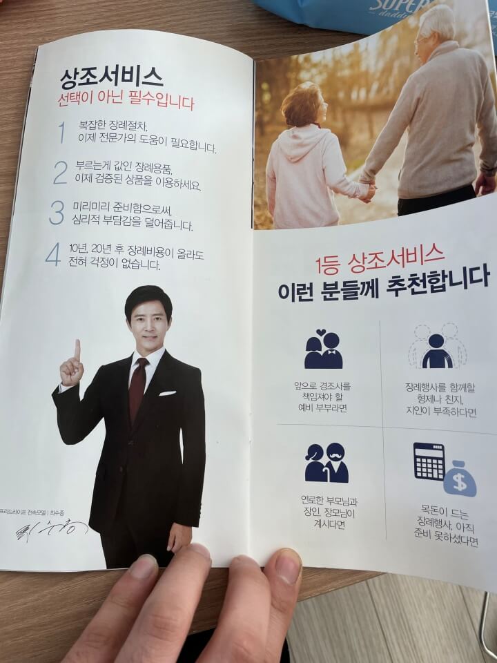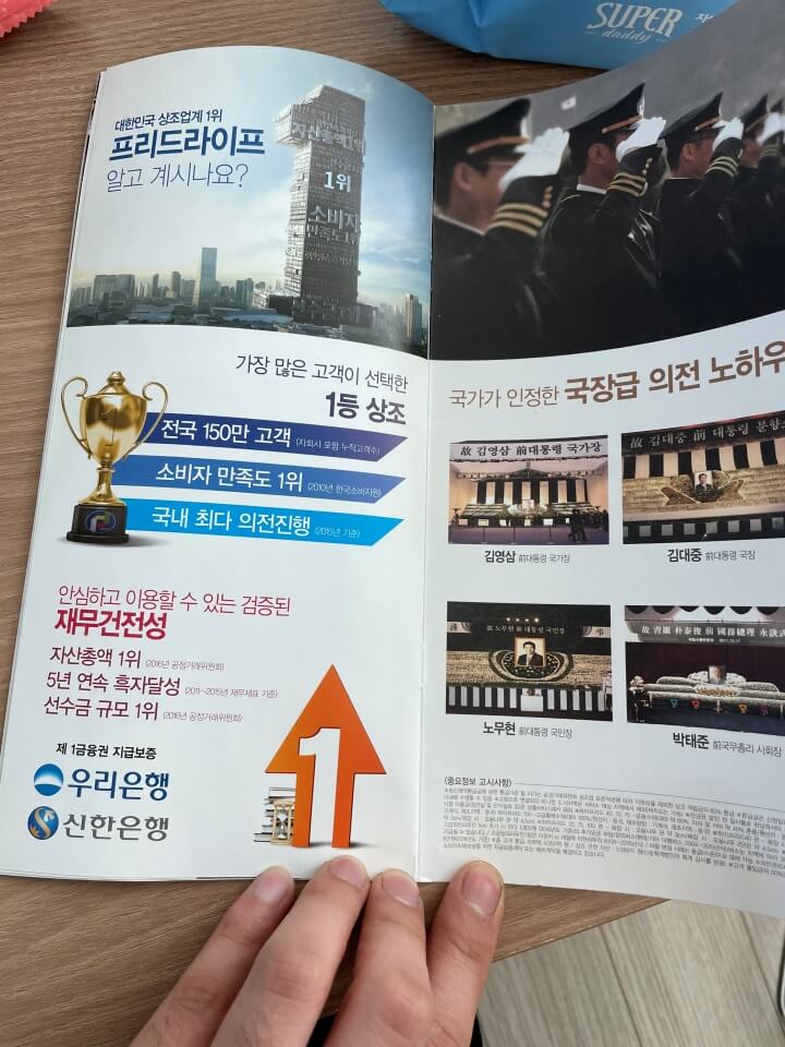 이건 그 당시에 구입을 하면서 받았던 혜택이 적혀있는? 그런 책자였어요. 배우 최수종씨가 광고하는 프리드라이프인데요. 상조업계에서 1등이라고 합니다. 상조업계가 자주 망하잖아요..프리드라이프는 비록 업계 1위지만 솔직히 불안하더라구요. 혹시나 회사가 망하게되면 냈던 금액의 50%만 받을 수 있다고 합니다. 저는 그때 당시 이걸 물어보지도 않았고 몰랐어요.. 알았으면 가입을 안했을거에요.