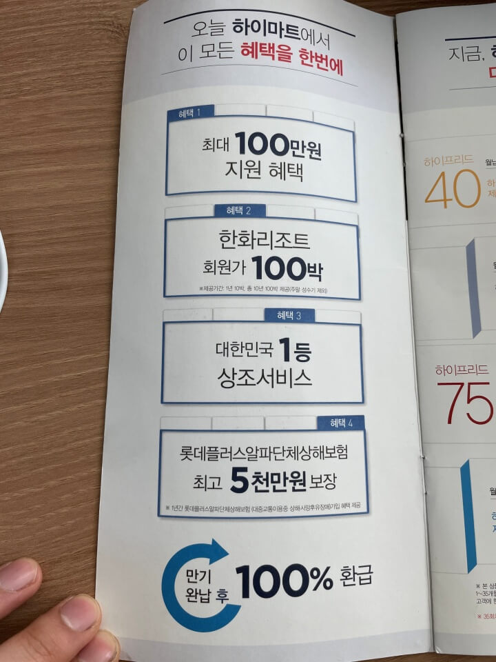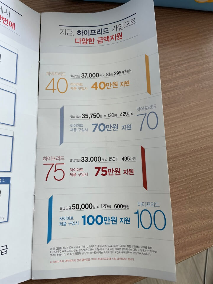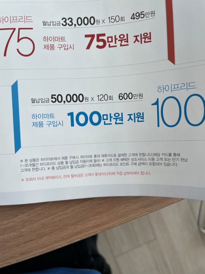 제가 가입을한건 프리드라이프100 상품이었어요. 아마 지금도 하이마트에 관련해서 상품을 묶어서 판매하는걸로 알고있어요. 잘보시면 작은글씨로 써있어요. 본 상품은 하이마트에서 제품 구매시 하이마트 롯데 제휴카드로 결제한 고객에 한합니다. (해당 카드를 통해 1~35개월간 하이프리드 상품 월 납입금 자동이체 필수), 고객 지원 혜택은 상조서비스 이용 고객 또는 만기 완납 고객에 한합니다. 총 납입금과 월 납입금(1~35회)에는 하이프리드 포인트 구매 금액이 포함되어 있습니다. 35회차 이내 계약해지시, 잔여 할부금은 고객이 롯데카드에 직접 납부하여야 합니다.