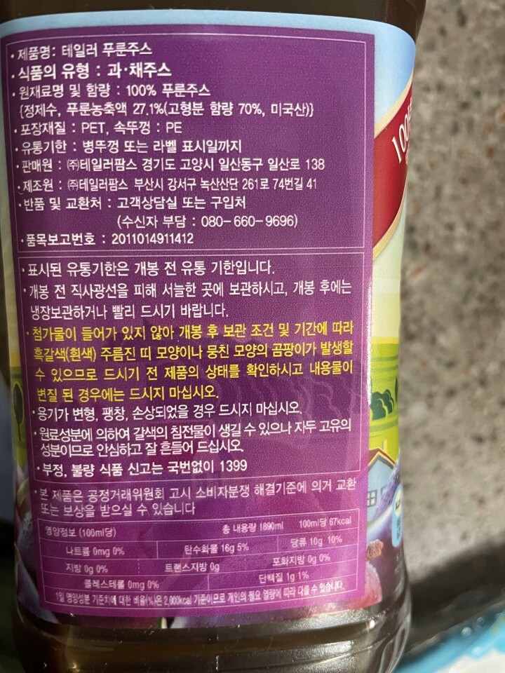 푸룬주스의 함량과 주의사항등이 적혀 있습니다. 유통기한을 잘 보시고~! 개봉하면 직사광선을 피해 서늘한 곳이나 냉장보관해서 빨리 먹으라고 합니다. 첨가물이 들어가 있지 않아 혹시나 흑갈색 주름진 띠 모양이나 뭉친 모양의 곰팡이가 발생하면 먹지마라고 합니다. 유의해주시기 바랍니다. 이걸로 임산부 변비에 좋은 푸룬주스를 알아 보았는데요~! 안에 따른 첨가물이 들어가있지 않아 임산부가 먹어도 괜찮다고 합니다. 변비로 고생하시는 임산부들은 푸룬주스 한잔 해보시는게 어떨까요?? 맛은.. 그럭저럭 먹을만해요..!