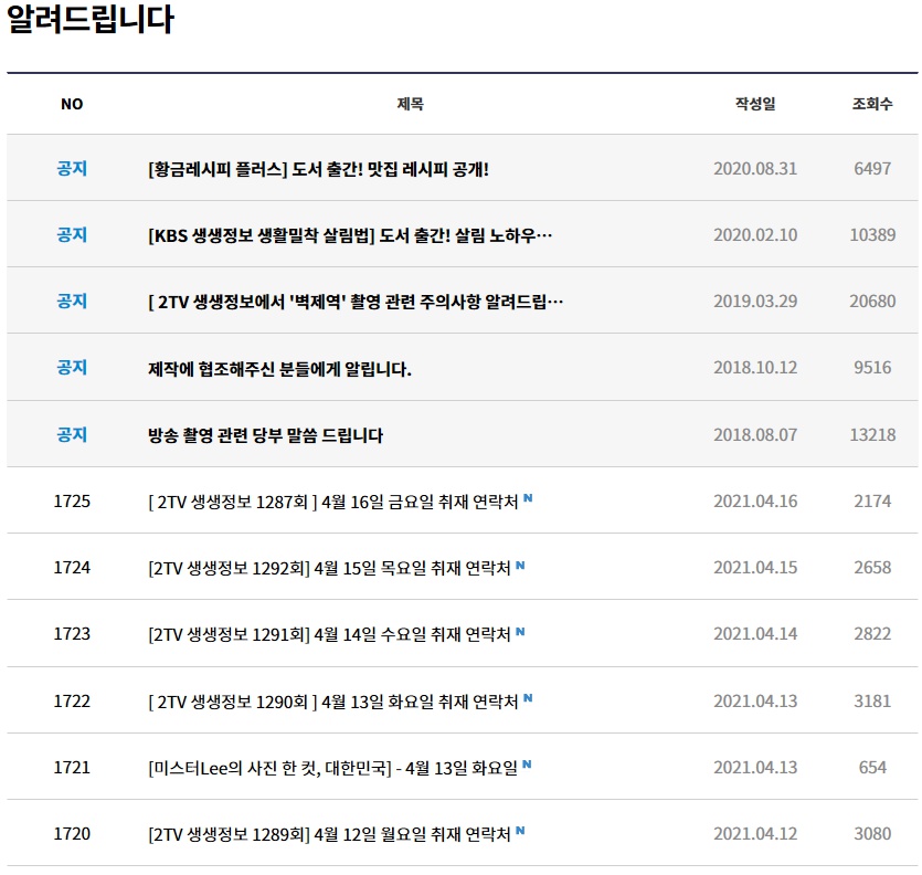 2TV 생생정보에 나온 맛집을 알아보겠습니다. 생생정보통 맛집오늘방송인데 못보셨으면 어디인지 모르는거잖아요. 홈페이지 겨서서 프로그램 소개에 알려드립니다를 클릭하시면 방송했던 내용들이 나옵니다.