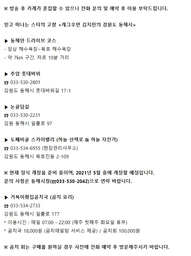 요렇게 4월16일 금요일에 방송에 나왔던 음식점들의 위치와 전화번호가 나와 있습니다. 대동 맛 지도에 나왔던 곰집갈비는 전라남도 목포시 호남로 58번길 14 영업시간은 오전11에서 오후 10시까지 기타 등등 다 나와있어요..! 이걸보고 맛집을 찾아 가시면 될 것 같아요.