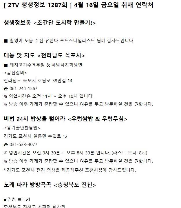 요렇게 4월16일 금요일에 방송에 나왔던 음식점들의 위치와 전화번호가 나와 있습니다. 대동 맛 지도에 나왔던 곰집갈비는 전라남도 목포시 호남로 58번길 14 영업시간은 오전11에서 오후 10시까지 기타 등등 다 나와있어요..! 이걸보고 맛집을 찾아 가시면 될 것 같아요.