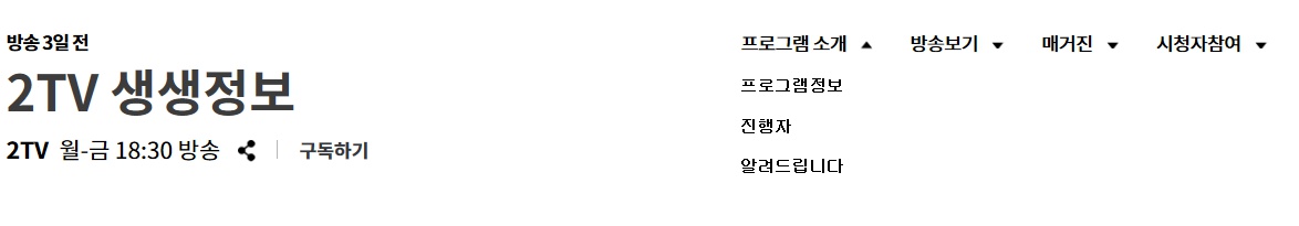 2TV 생생정보에 나온 맛집을 알아보겠습니다. 생생정보통 맛집오늘방송인데 못보셨으면 어디인지 모르는거잖아요. 홈페이지 겨서서 프로그램 소개에 알려드립니다를 클릭하시면 방송했던 내용들이 나옵니다.