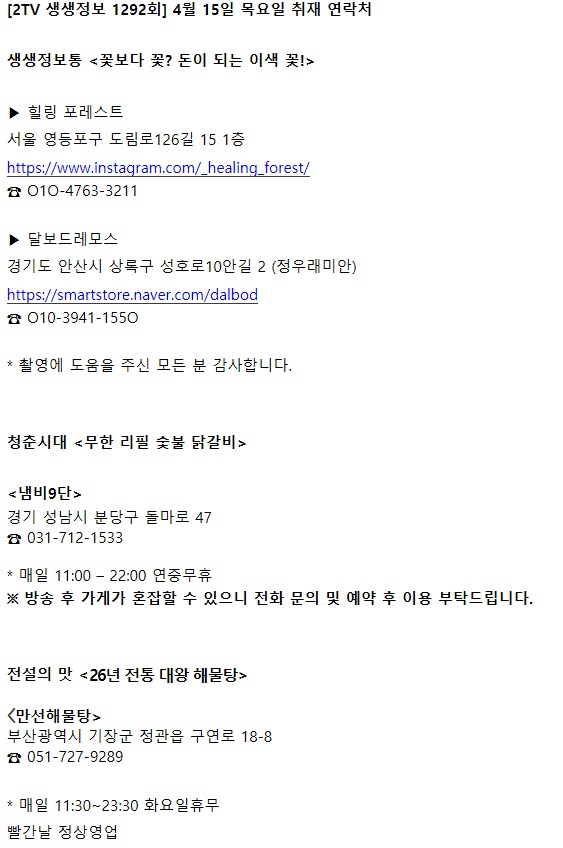 목요일에 했던 생생정보통 맛집오늘방송입니다. 여러가지 가게에 관한 정보가 많이 있죠??4월 15일 목요일에는 닭갈비, 해물탕 여러지역의 맛집들이 많이 소개가 되었어요. 모든 정보는 KBS 2TV에 생생정보에 있으니 많은 참고 바랄게요.