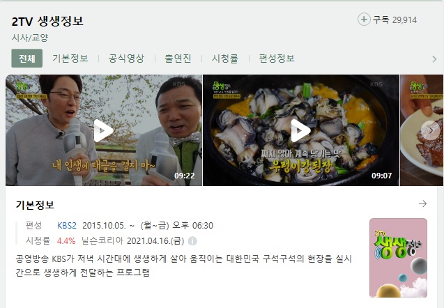 2tv 생생정보는 KBS 2 티비에 월요일부터 금요일 오후 06시30분에 방송합니다. 시청률은 4.4%정도 나옵니다. 저녁시간대에 대한민국의 현장을 실시간으로 전달하는 프로그램이라고 합니다.