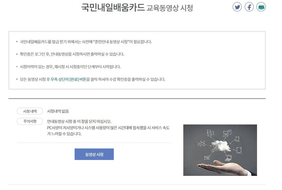 내일배움카드의 동영상 시청입니다. 발급을 받기 위해서는 꼭 동영상 시청이 필요하고 확인증은 로그인 안내동영상을 시청하면 출력할 수 이싿고 합니다. 시청이력이 있는 경우에는 시청중이던 단계부터 시작된다고 합니다.